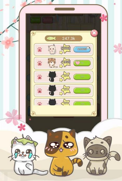 主打自由建造与生态观察玩法。场景装饰支持四季主题切换,猫爬架、猫窝等设施无摆放限制与预算约束。收录三十多种真实猫种,每种具备独特行为习性。互动方式涵盖梳毛、逗猫棒玩耍、拍照留念三类基础操作,达成条件后可解锁拥抱、击掌等进阶互动。整体采用低饱和度清新配色,猫咪面部表情细腻丰富,背景音乐采用钢琴与竖琴编曲,营造舒缓氛围。