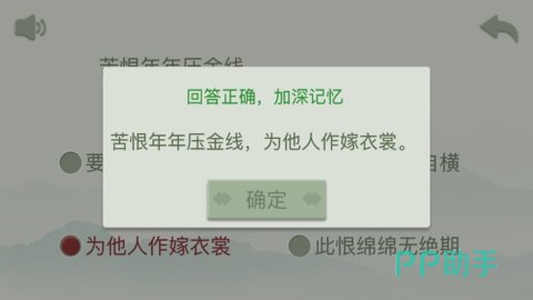 聚焦唐诗宋词核心文本,收录《唐诗三百首》《宋词三百首》全部篇目及课标指定拓展篇目。玩法涵盖诗句填空、作者匹配、意象解读三大类型,并独创双人实时对战模式——双方同步接收同一首诗词的残缺句式,率先完整补全者获胜。难度档位明确区分小学、初中、高中适用层级,适配不同阶段古诗文学习需求。