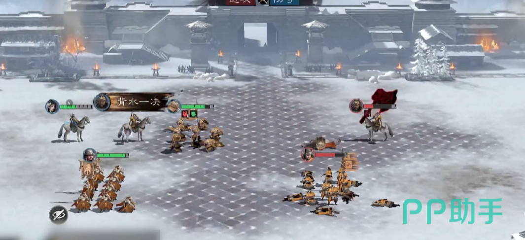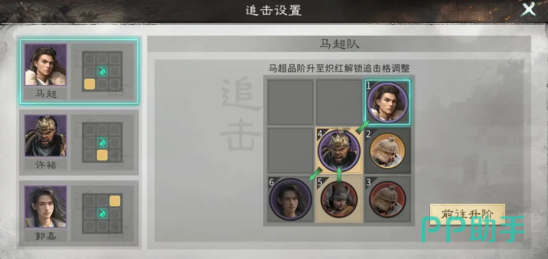 站位,孙权放在统帅位置,让其属性增益最大化;吕布和郭嘉就放在副将的位置,形成三角的配置;虽然牺牲了吕布的追击格,但是孙权和郭嘉则拥有了追击机制,整体战斗节奏更加灵活。