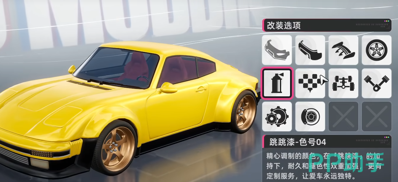 选择改车方案的选项,会进入到改装的界面,此时下方有一个维修和改装的按钮,点击维修花费一定金币后,可以让被撞击到破破烂烂的车直接变成新车,点击改装则可以进行给车辆改变颜色、更换前面保险杠、加酷炫尾翼等不同操作,将车辆变成自己喜欢的样子。