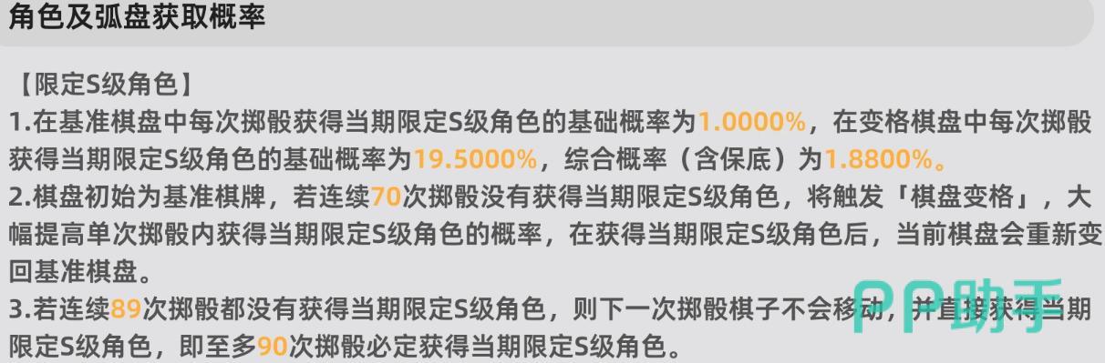 它的抽卡是类似大富翁、飞行棋走格子的玩法,在基准棋盘中每次掷骰子获得当期限定S的基础概率是1%,而在“变格”棋盘的中获得当期限定S的概率是19.5%,综合下来保底概率是在1.88%。