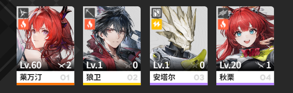 这是以莱万汀和狼卫作为核心的,主打灼烧附着的低配阵容,其中安塔尔和秋栗可以灵活的更换为其他灼热体系的甘愿或者其他自然体系的辅助。莱万汀自然不必多说,首个up,开荒期攒的资源差不多可以拿下,拿不下也可以看着抽数差不多了等稍后进常驻池。定位是非常优质的灼热输出,可以重击可以吸收灼热附着强化战技效果。大招也可以灼热附着,配合天赋可以快速叠加熔火层数,战技则是4层熔火后强制燃烧,并且可以在开大的期间强化效果,回复大招能量,大招则是能在4层熔火后释放战技触发。