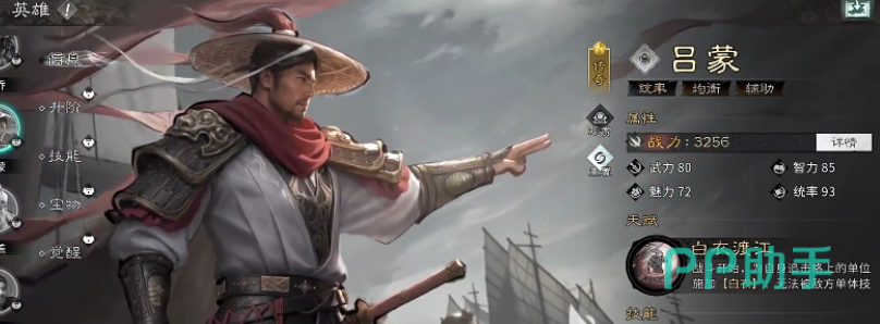 这是均衡性辅助,辅助能力比较均衡。天赋效果:在战斗初始时,给个人追击格上目标施加“白衣”,属于一种被动增益,能够在开局瞬间给队伍整体提供隐形护盾,在后续多个轮数中都能持续发挥作用。这个机制也是让队伍在前期的生存能力就得到大大提升,尤其适合保护追击位置上的武将。有了他在,队伍前期也不会被强力压制,中期就可以更加安心的展开攻势,在对局初期就能建立较为明显的优势。