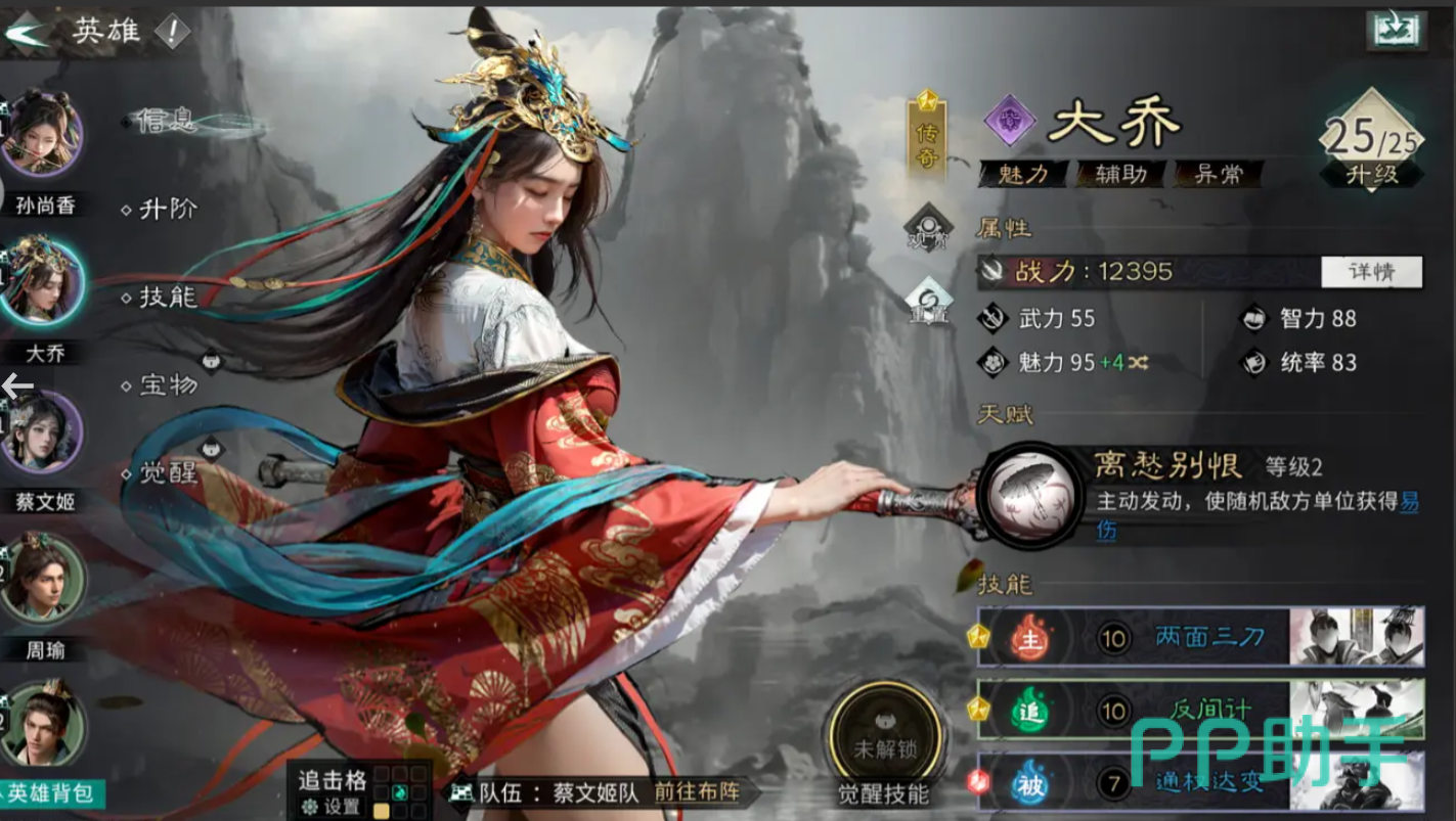 这是个性价比很高的辅助英雄。天赋“离愁别恨”,主动行动时发动,随机个2名敌人各添加5层“离愁”效果,离愁从每层获得4%易伤,持续2轮,最多叠加8层,受击后减少1层。这个英雄的获取难度很低,也是大家必备的英雄,易伤效果能大幅度提升对名将的伤害,而且这个效果大多数英雄都能吃到,且还具备一定的恢复能力,能够适配的阵容也比较多,适配性较高。