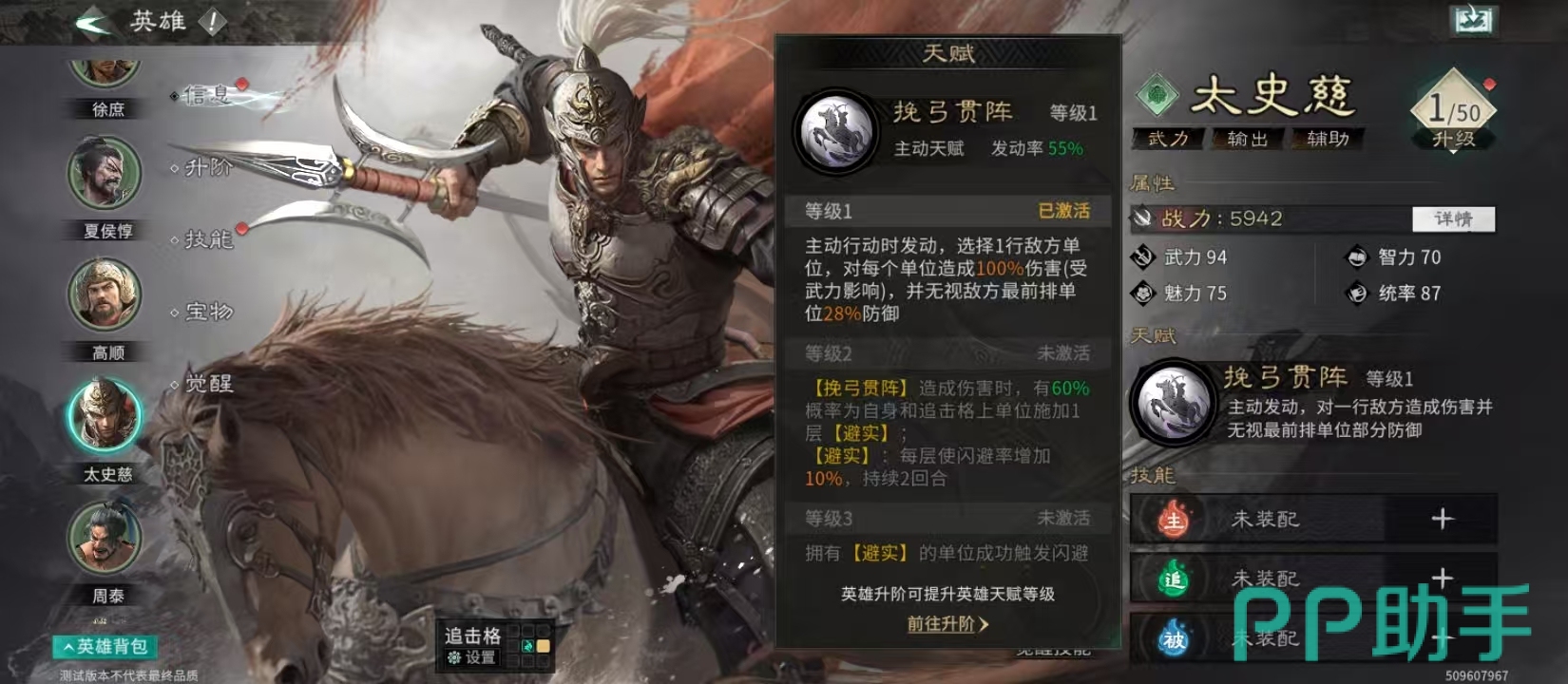 核心天赋“挽弓贯阵”是其战术支点:1级即拥有55%发动概率,三回合内至少触发一次,稳定性极佳。技能效果具备双重压制逻辑——首先对敌方单列目标造成100%武力伤害,覆盖范围精准;其次“傲世”特性可无视前排单位28%防御,相当于直接削弱敌方主坦护甲层级,大幅降低后续伤害破盾门槛。若队伍中配置具备全队加速能力的辅助武将,可显著提升太史慈出手优先级,实现先手压制。