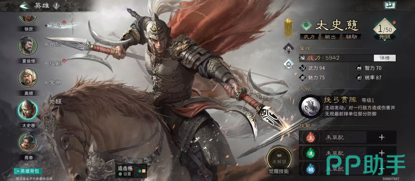 当前版本中,太史慈武力值稳定维持在94点,配合682点总攻击与30%伤害加成,实战爆发远超纸面数值。统帅87点保障前排站位可行性,317点总防御叠加5%闪避率,使其具备一定生存韧性。需注意的是,智力仅7点,面对高频法术控制时易被限制行动;速度固定为10点,属于全队明显短板,必须通过阵容协同(如搭配增益型提速武将)予以弥补。
