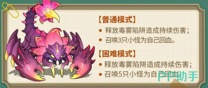 粉红娘娘(普通/困难难度):机制侧重环境管控与节奏打断。其毒雾陷阱呈淡粉色圆形区域,持续存在6秒,踏入后每秒扣除当前生命值2.5%,最多叠加3层。同时,该BOSS会周期性召唤辅助单位为其回血:普通难度召唤3只“蚀心蝶”,困难难度增至5只;每只蚀心蝶存活期间每秒为粉红娘娘恢复0.8%最大生命值。打法要点明确:全员佩戴解毒类增益或携带位移技能保障机动性;蚀心蝶出现瞬间即启动AOE清场,严禁放任其存活超过3秒。