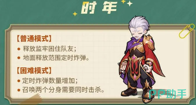 时年(普通/困难难度):综合机制最复杂的多线程BOSS。核心威胁包括三类:监牢技能(随机禁锢一名队友,持续4秒,被禁锢者无法行动且承受额外20%伤害)、定时炸弹(落地后3秒爆炸,造成半径1.8米内260%攻击力伤害,普通难度布设2枚,困难难度增至4枚)、双分身机制(困难难度专属,两个分身共享本体50%生命值,但必须在5秒内同步击杀,否则全部复活并强化下一轮技能)。应对方案强调分工:指定1名队员专职破牢(需携带解除控制类技能),其余人员轮换标记炸弹位置并协同走位;双分身阶段启用统一集火指令,确保DPS分配均衡,避免单点超杀导致另一分身残血续命。