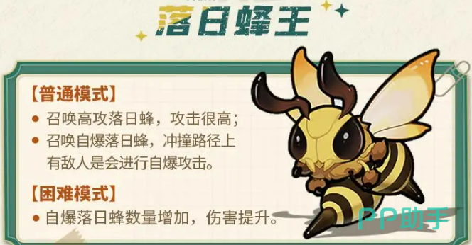 落日蜂王(普通/困难难度):技能组合以持续压制为核心。其召唤单位含两种蜂类:落日蜂(锁定单体追击,每2秒造成一次180%攻击力的物理伤害)与自爆蜜蜂(沿直线冲锋,接触目标或抵达终点时爆炸,造成半径2米内320%攻击力的范围伤害)。普通难度各召唤2只,困难难度均增至4只。推荐处理顺序为:先集火清除全部落日蜂(防止持续减员),再利用位移技能规避自爆蜜蜂路径,切忌贪刀站桩输出。