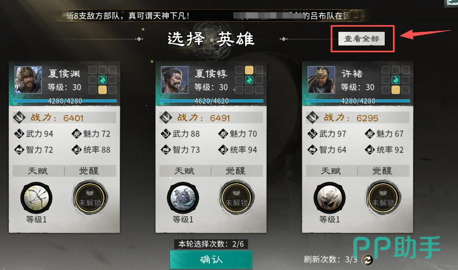 英雄配置应聚焦功能互补与战术协同。推荐组合为典韦+许褚:许褚天赋“背水一绝”可造成350%单体爆发伤害,并触发“血战”效果——目标阵亡后,自动选取新敌继续追击,形成持续压制链;典韦则承担核心保护职能,战斗开始时自动守护我方战力最高单位,承伤比例达50%,并附带反击机制,为许褚创造安全、高效的输出环境。选择前务必点击界面右上方“查看全部”,完整浏览当轮可选英雄池,避免盲目刷新导致优质选项流失。