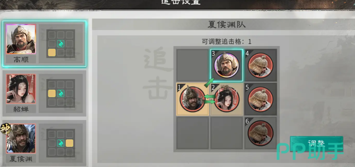 本阵容采用“双辅一主”结构:夏侯渊担任核心输出位,高顺与貂蝉分别承担前排承伤与机制增益职能。三者技能逻辑高度耦合,形成闭环式输出循环。兵种配置推荐统一选用藤甲兵,三名单位均部署于前排,最大化物理减伤收益。站位设计尤为关键——建议将夏侯渊置于貂蝉与高顺的追击路径交汇点;同时让貂蝉自身也处于夏侯渊的追击格内,而高顺则无需占据追击位。此布阵可确保貂蝉闭月之貌被动全程生效,并为夏侯渊提供稳定触发追击的环境基础。