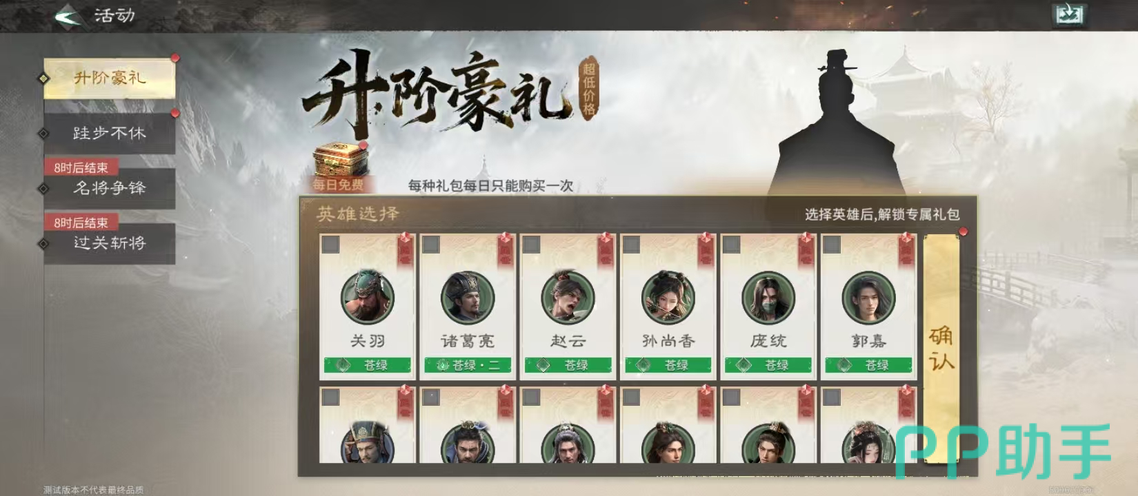【升阶豪礼】活动提供武将定向养成支持。界面开放诸葛亮、孙尚香、赵云、关羽四位可选名将,选定后立即解锁专属升阶礼包。以关羽为例,礼包内含升级材料包,实现资源精准投放,避免培养浪费。每日左上角“每日免费”按钮可一键领取英雄养成材料,全程零消耗。各武将升阶礼包每日限购一次,定价亲民:如诸葛亮升阶包仅需少量玉髓,即可获取关键突破道具。此外,“跬步不休”登录任务持续发放道具与材料包,后续阶段还将追加进阶奖励,助力长期成长。