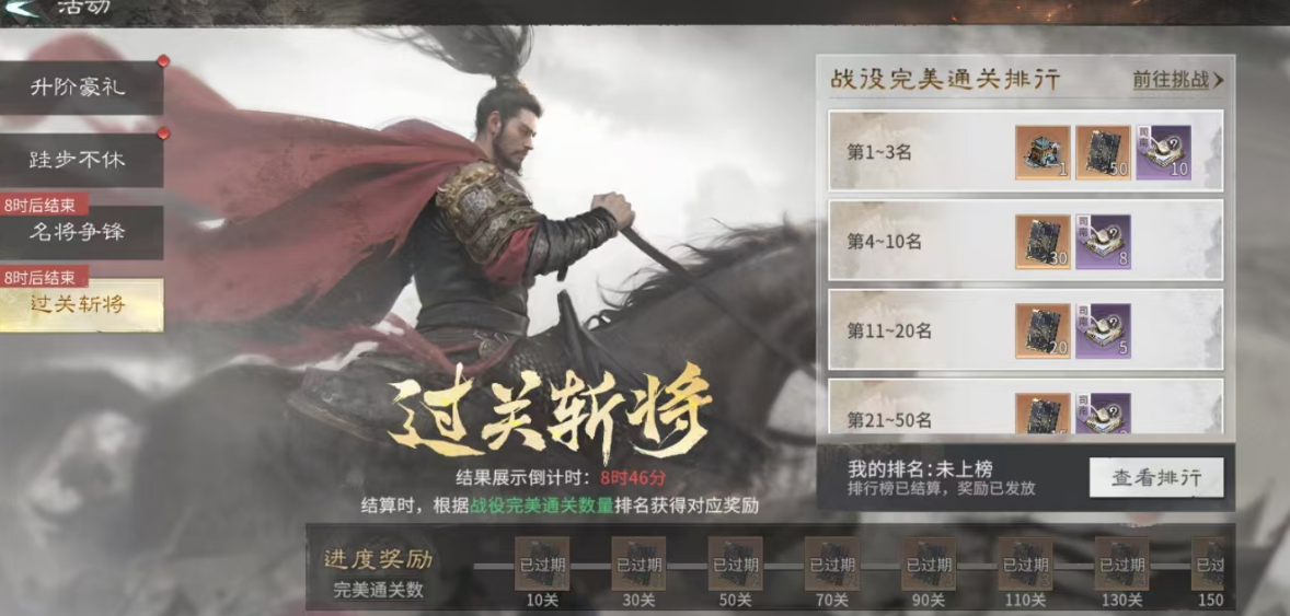 【过关斩将】为关卡挑战类玩法,强调通关质量与效率。达成完美通关(全员存活+达标时间)后,榜单前三名可获得专属武将皮肤、10个限定道具及50本技能书;皮肤不仅具备独特视觉表现,还可直接提升武将基础属性。第4至第10名则获得8个限定道具与30本技能书,有效支撑核心武将的持续突破。建议玩家优先复盘未获完美评价的关卡,动态调整阵容配置,提升整体容错率与通关稳定性。