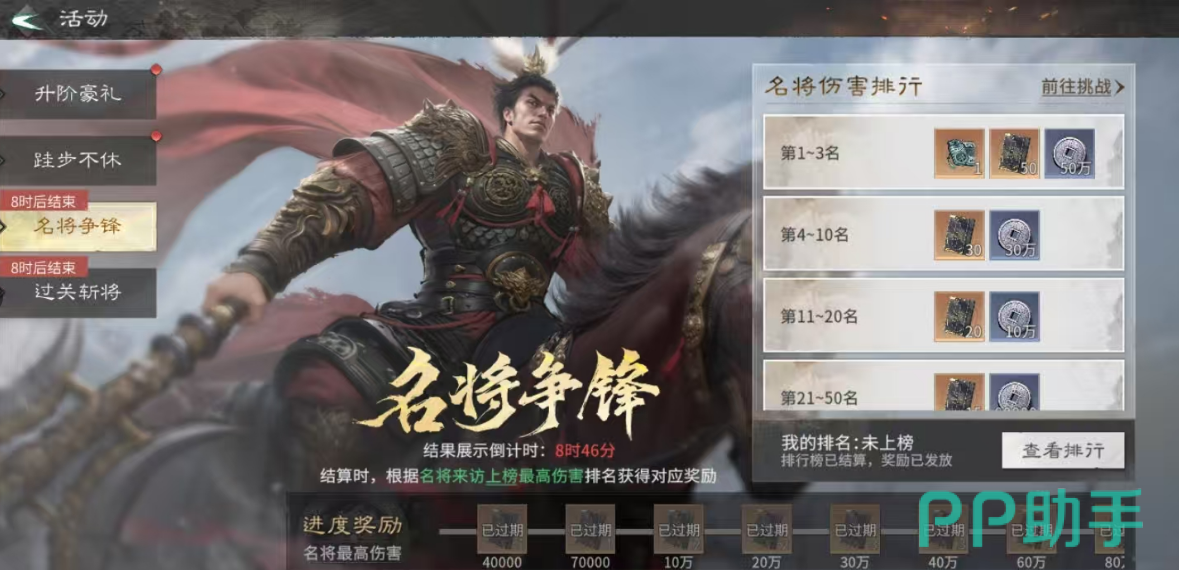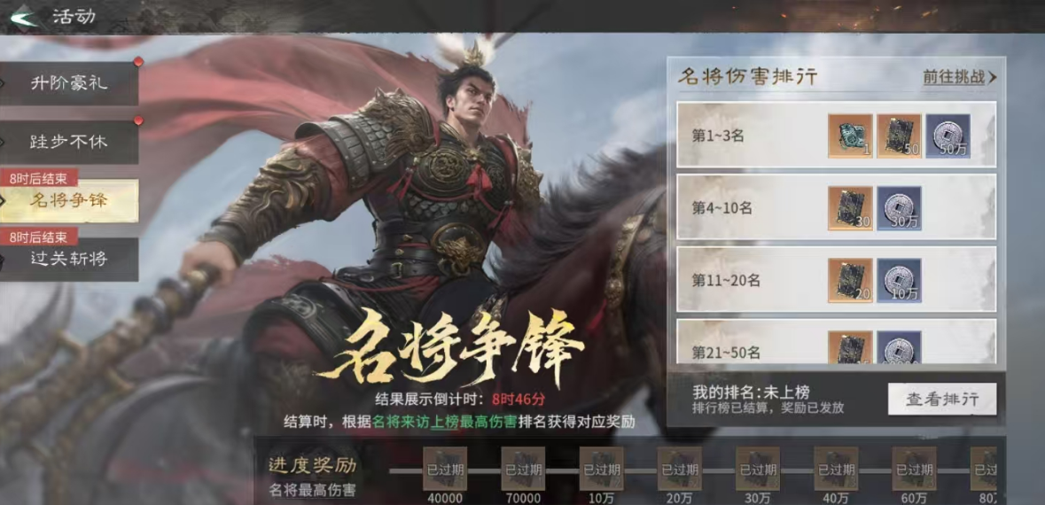 【名将争锋】为实时排行榜玩法,依据结算排名发放梯度奖励。活动结束时,榜单前三名可获得50万资源、1个玉髓道具及50本英雄技能书;第4至第10名则获得30万资源与30本技能书,足够支撑主力武将完成两次大阶级突破。冲榜策略建议:优先选用练度较高的武将,确保装备、技能等级全部拉满,并搭配最优增益buff出战,最大化单次输出伤害。合理控制资源节奏,精准锁定高回报段位。