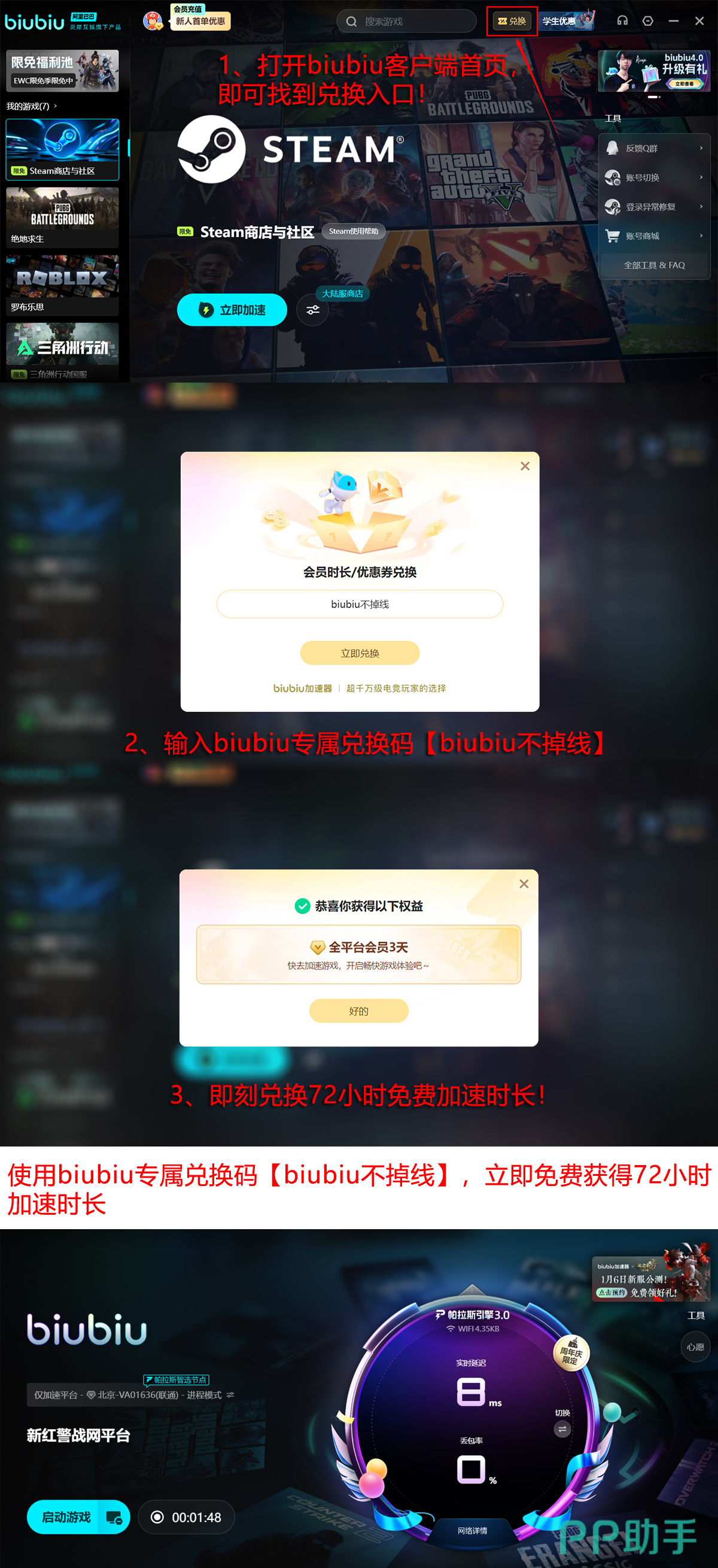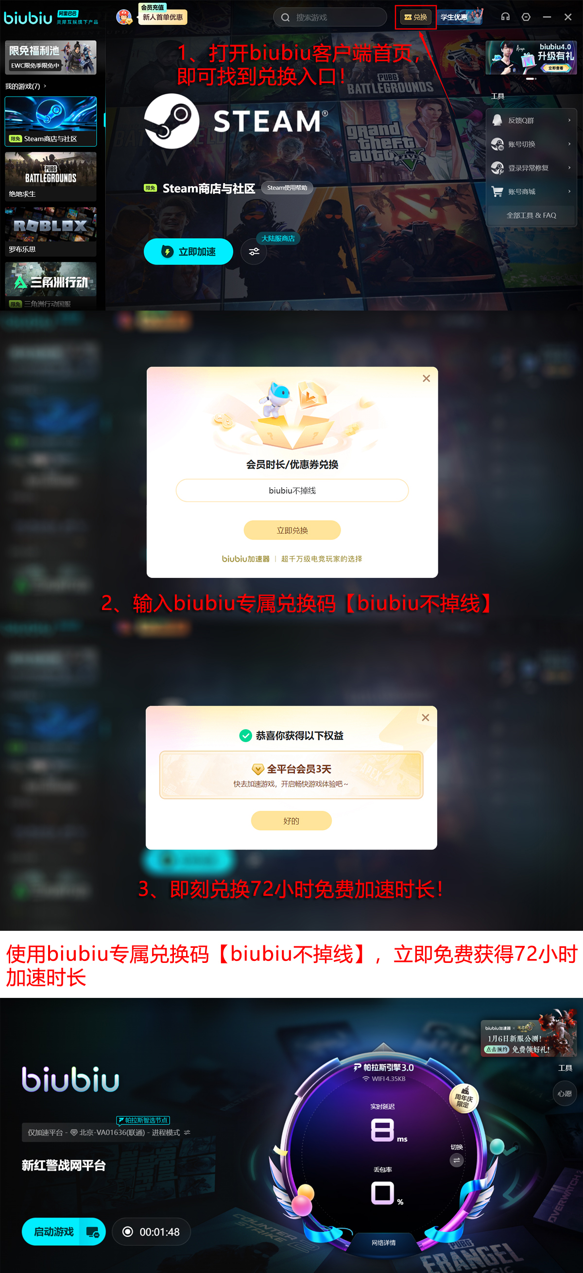 除稳定性外,服务权益亦具实用性:新注册用户可直接领取24h基础加速时长;输入专属激活码【biubiu不掉线】后,额外获赠72h使用权,合计达96小时。同步开展的冬季促销活动(时间为12月18日到1月18日)新增多款热门游戏加速支持,且Steam平台用户同样可无缝接入该服务。