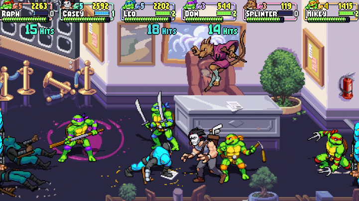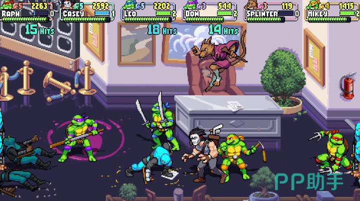 本作高度还原经典街机横版动作体验,采用复古像素画风,角色建模与场景细节兼顾辨识度与表现力。四名可操作忍者龟各具独特技能与属性倾向,支持本地/在线多人协作。关卡中设有可交互道具箱、隐藏区域与动态陷阱系统,鼓励探索与操作预判。敌人AI具备基础行为逻辑,配合场景机关形成复合挑战,怀旧感与新鲜感并存,是横版动作爱好者值得体验的诚意之作。