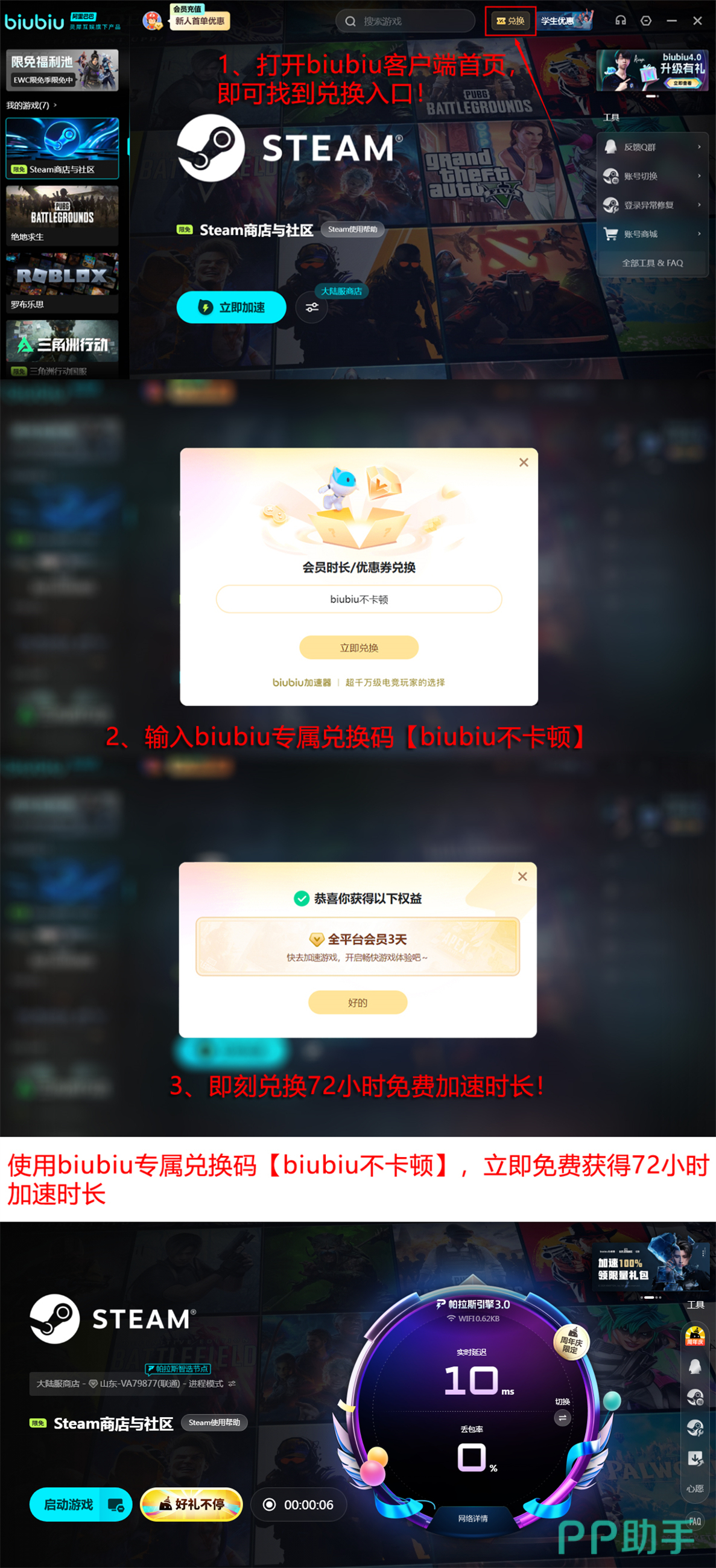 为帮助玩家快速验证效果,平台同步开放限时体验权益:输入兑换码【biubiu不卡顿】,即可领取3天全功能加速时长,每账号限用一次。新注册用户额外获赠24小时免门槛加速服务,首周总计享96小时免费使用周期,充分满足测试与过渡期需求。