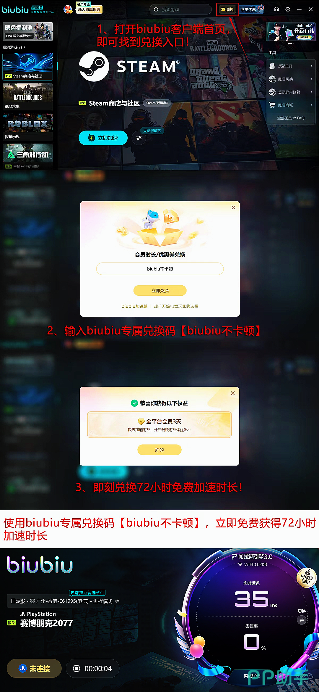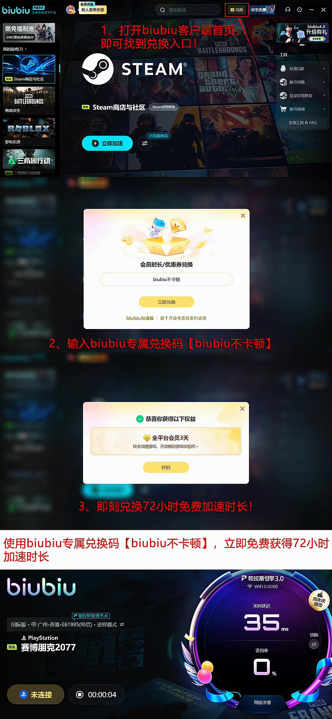 新用户注册biubiu加速器后,可立即激活24小时全游戏免费加速权益;输入专属兑换码【biubiu 不卡顿】,还可叠加领取3天额外时长,总计享96小时无限制加速服务;该福利同样向存量用户开放,无需额外条件。