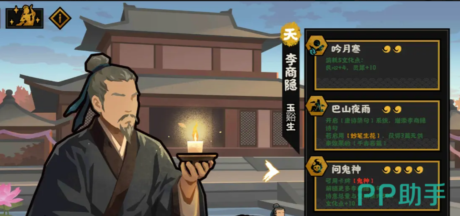 他的“吟月寒”需要消耗5点文化点,让民心加4,灵犀加10,对于属性的提升有一定溢出,他的“巴山夜雨”会开启唐诗集句系统,在这里增添李商隐诗句,如果启用“妙笔生花”就能获得3篇没有供率效果的千古名篇。