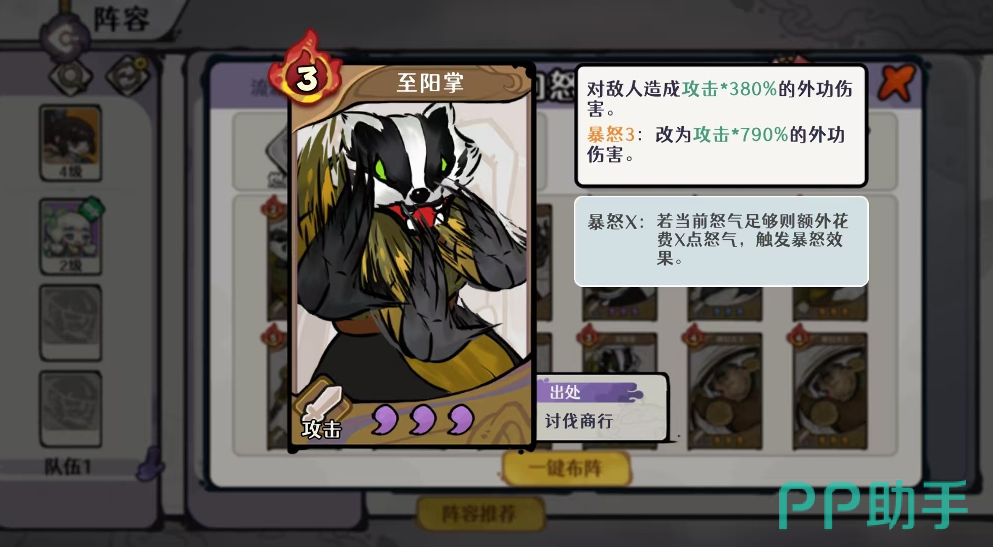 回怒流玩法的核心是抽满手牌,然后打出临渊龙王的武侠卡牌玉龙杖法,利用暴怒牌的高怒气消耗打出巨额伤害。在决策选择方面,豪侠位置选择的是狂暴金师,这是一个宗师级角色。他的武学卡牌竭力之护,效果是可使目标获得30%防御的护甲,并获得力竭效果,该效果是消耗所有怒气后触发,每点怒气可以额外获得60%防御的护甲。真气技能是没有护甲的随机友方获得300%防御的护甲,如果都有护甲,则回复2点怒气。