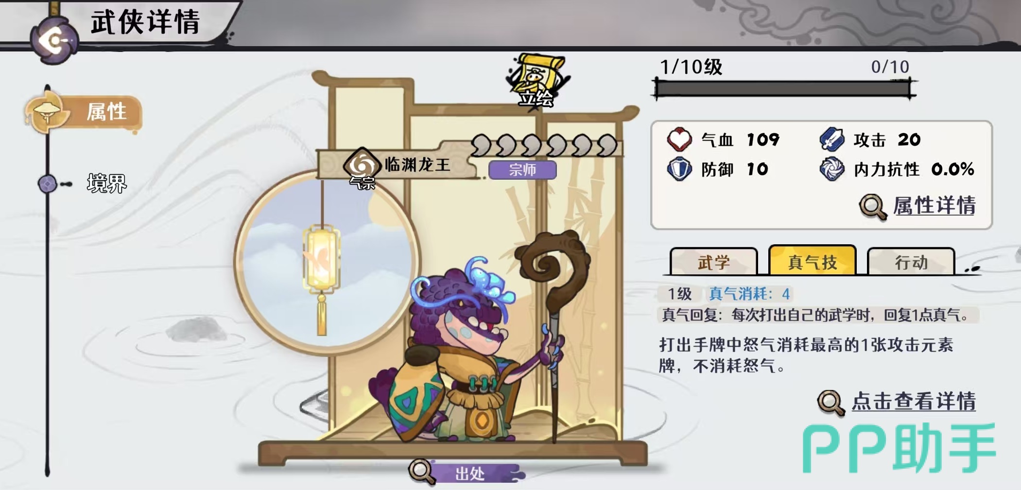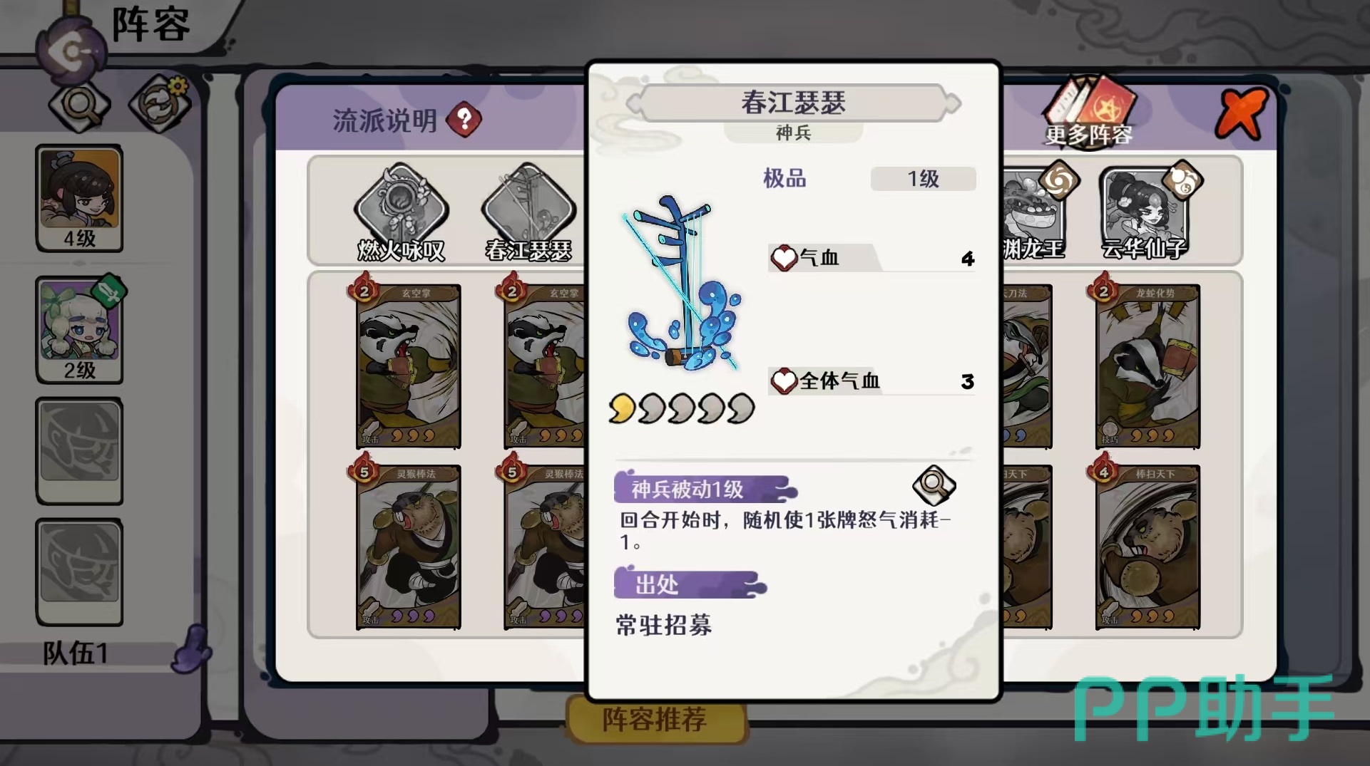 气宗位置选择的是临渊龙王,也是这套搭配的核心,他的武学卡牌是玉龙杖法,对敌人造成90%攻击的外功伤害,所有其他手牌每有一点怒气消耗,额外造成50%攻击的外功伤害。真气技能效果是打出手牌中怒气消耗最高的一张攻击元素牌,不消耗怒气。悬壶位置选择的是云华仙子,武学卡牌效果是抽两张牌,有暴怒效果,如果当前怒气足够则额外花费2点怒气触发暴怒,改为抽三张牌,且优先武侠卡牌。真气技能效果是恢复2点怒气,并使少年获得三层攻击增强。在神兵选择方面,小编推荐的是燃火咏叹、春江瑟瑟和林暗惊风。