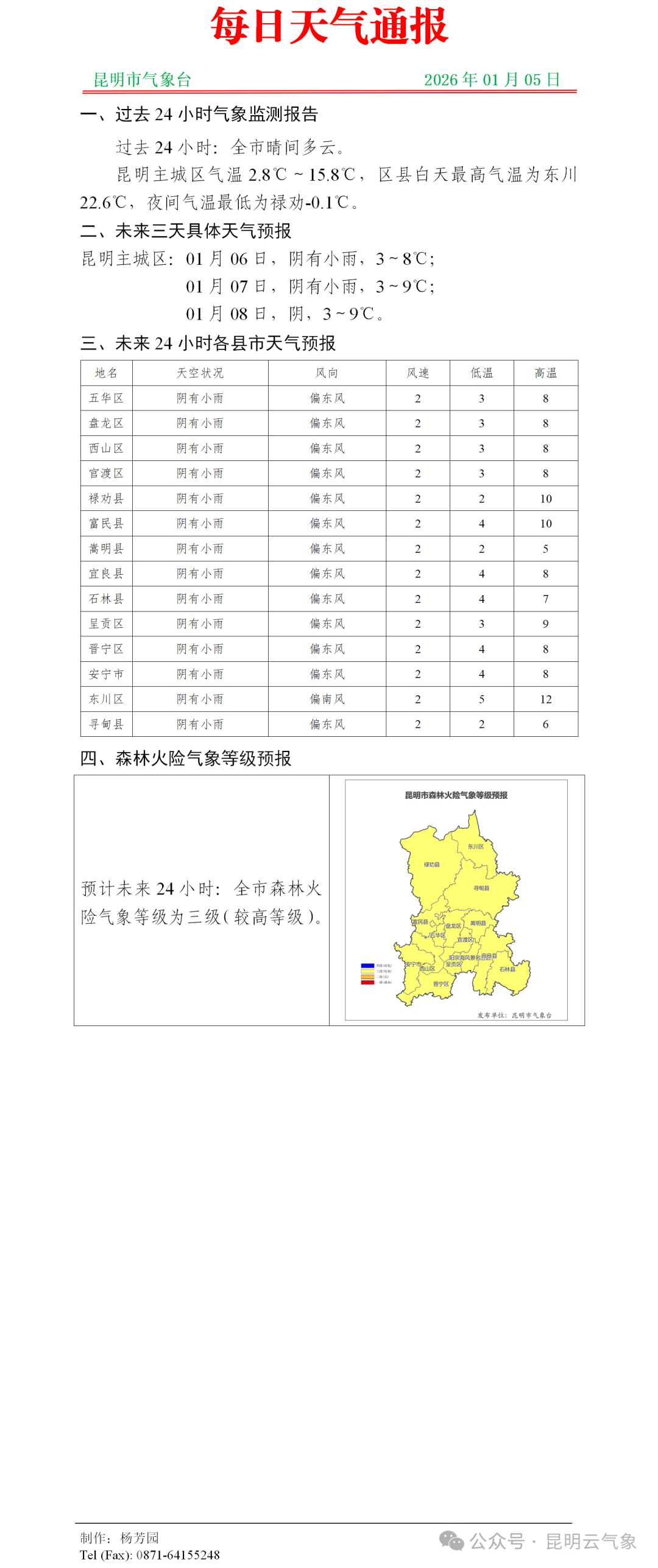 曲靖市中西部、昆明市、玉溪市东部、文山州中北部、红河州北部最高气温将下降6~8℃,局地下降超过10℃;昭通市东部和南部、曲靖市、昆明市东部、文山州北部、红河州东北部最低气温-2~3℃。昭通市、曲靖市、昆明市东部、文山州北部、红河州东北部的高海拔地区阴有小雪或雨夹雪,昆明市西部、楚雄州东部、玉溪市、文山州南部、红河州大部、普洱市东部、西双版纳州东部阴有小雨,其他地区晴间多云。