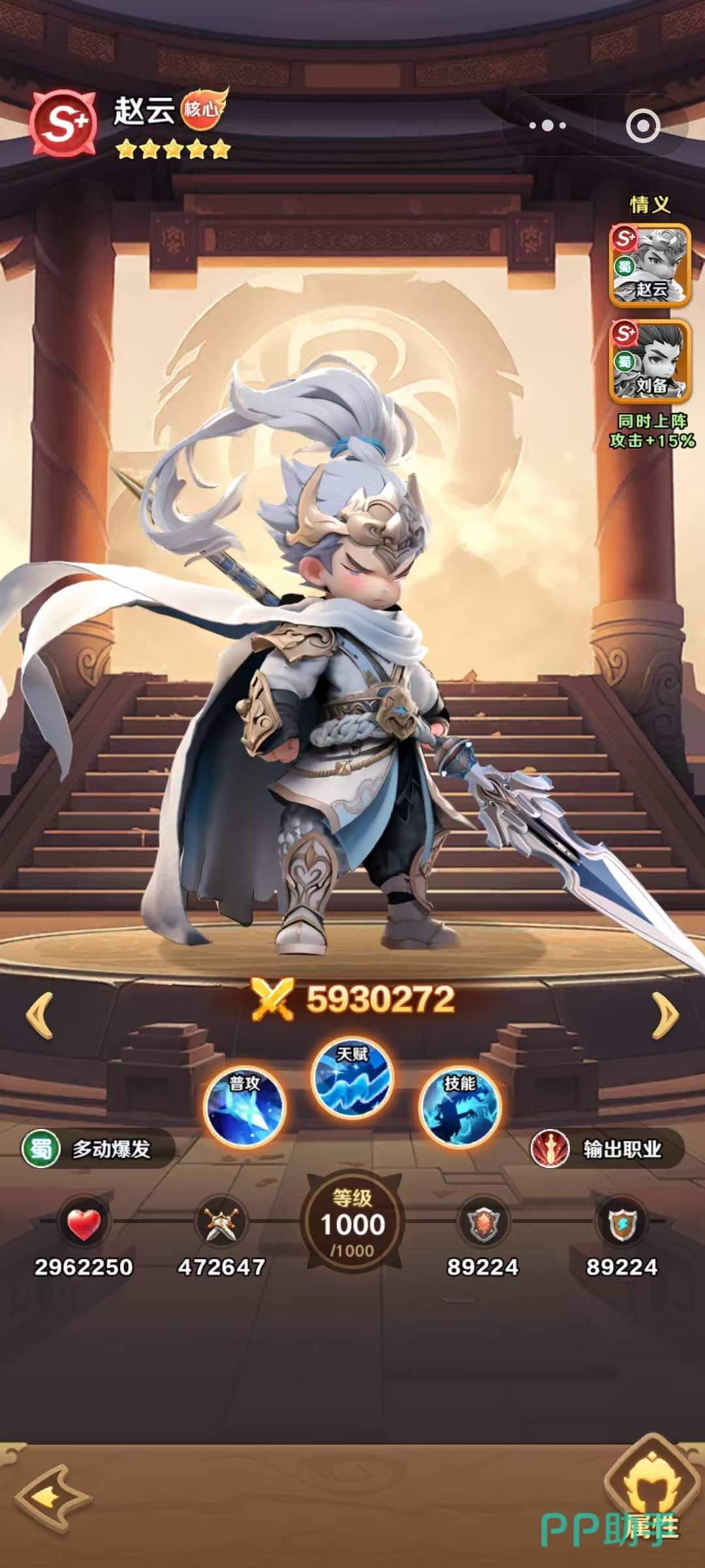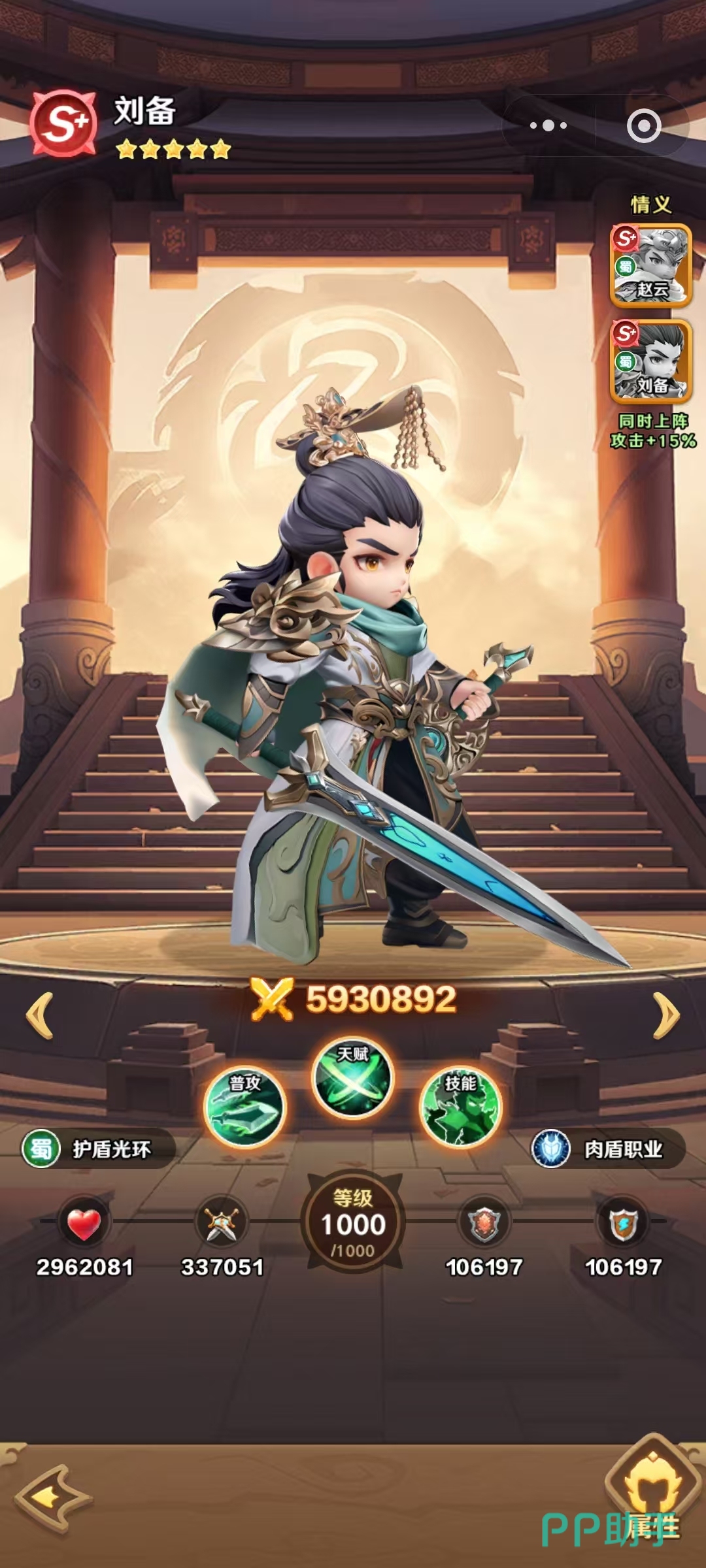 刘备是属于提供护盾和光环的辅助角色,他的天赋是给蜀国武将附加增伤和免伤。技能效果是对全体恢复生命值,并添加护盾和免伤效果,提升整个团队的续航。整套阵容就是依靠张飞的前排抗伤害和提供无敌护盾。这套阵容利用的是张飞为队伍提供防护,配合黄月英的群控沉默减速效果,压制敌方输出。赵云的追击多动机制带起关羽的追击收割能力,加上刘备的光环和诸葛亮的增伤回怒,拉高整个队伍输出上限,快速收割战场。