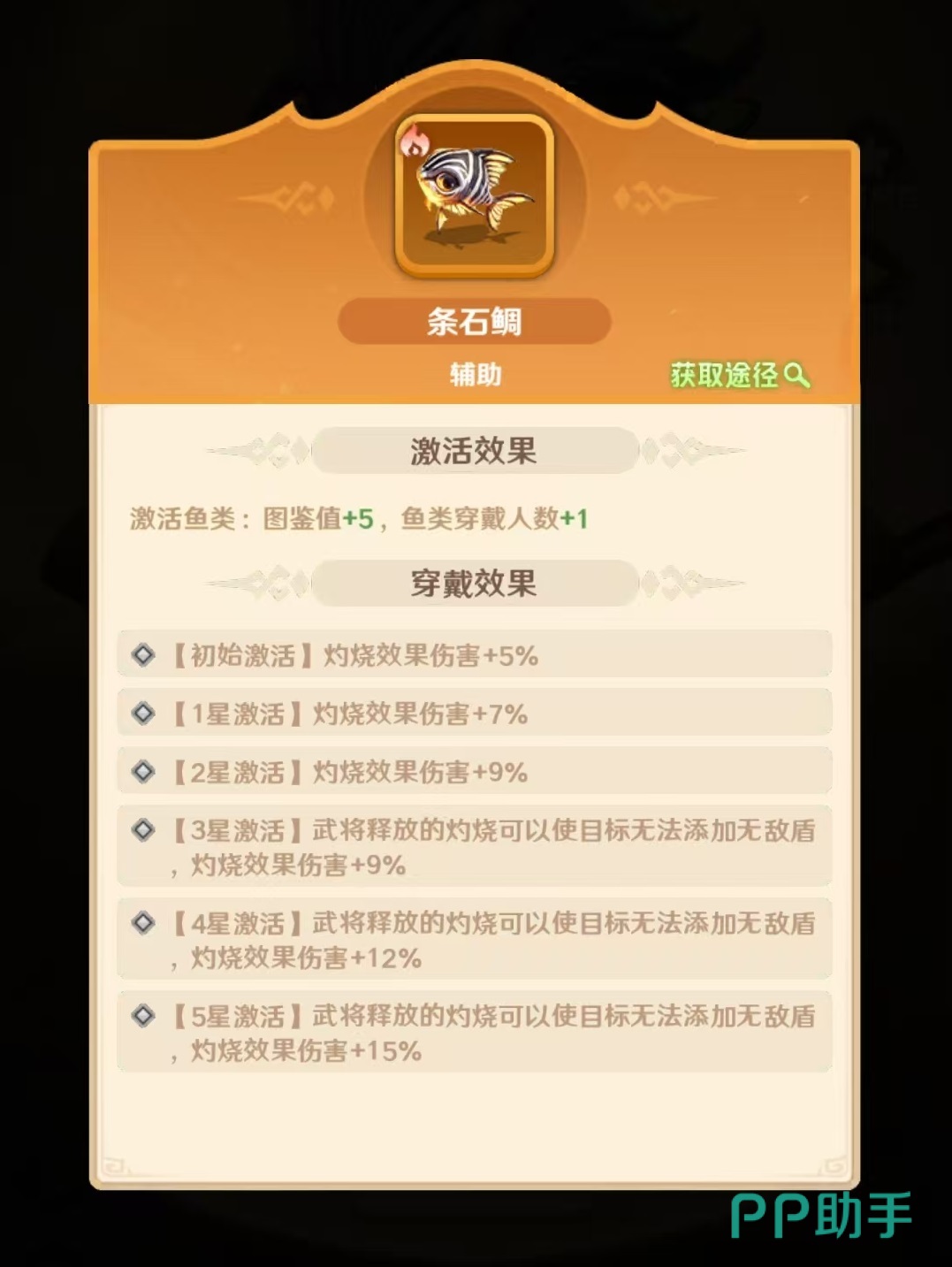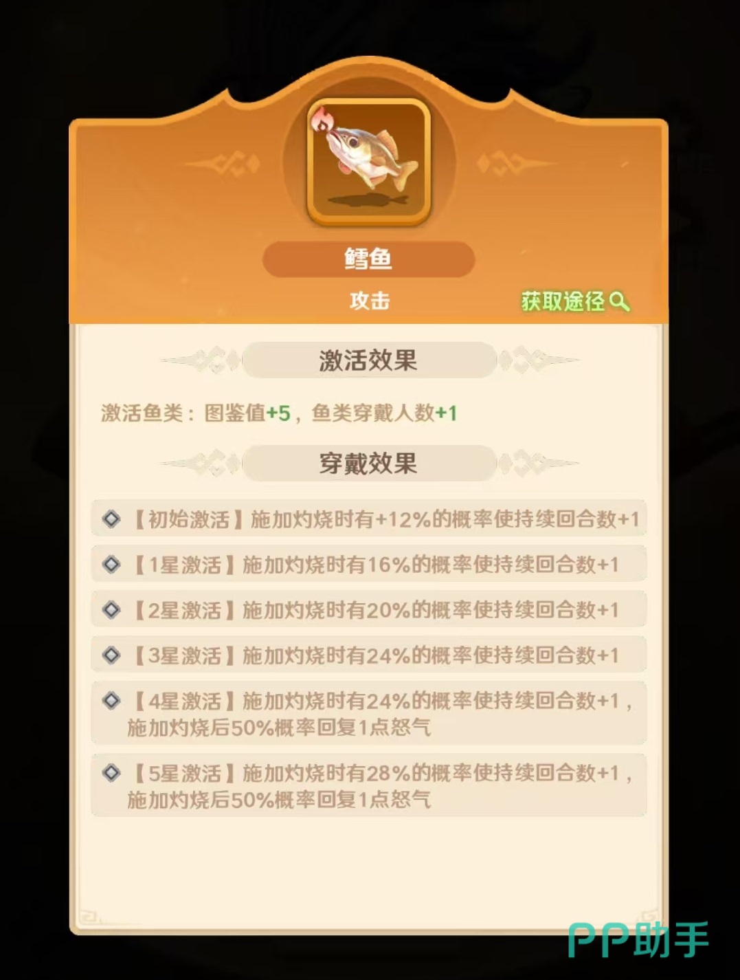 还有一些鱼类同样适合搭配,例如三文鱼,三文鱼的效果是被攻击时有几率给攻击者添加灼烧状态,持续两回合。但这条鱼和周瑜的配合程度并不高,因为周瑜并不是属于前排,他更适合给周瑜其他的前排队友搭配上。同样适合前排队友选择的还有鲟鱼,鲟鱼的效果是死亡时有几率对全体敌人添加灼烧状态,不适合周瑜但给队友带上效果也很出色。在大型鱼类方面,目前并没有比较适合周瑜或者是灼烧队选择的类型,所以目标应该放到提高生存能力上,只要能够增加生存都可以选择。