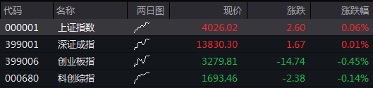 沪指涨0.06%,深成指涨0.01%,创业板指跌0.45%,科创综指跌0.14%。
