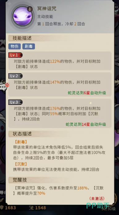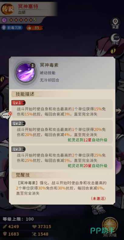 三技能【冥神毒素】为开局战略型增益技能:战斗首回合,为自身及我方攻击最高者提供15%免伤与15%抗控效果,每回合衰减3%,持续5回合。觉醒后效果升级为:为自身及我方攻击值排名前两位的单位,同步赋予30%免伤与30%抗控,每回合衰减6%,同样维持5回合。需注意:该效果不可叠加,若前次增益尚未完全消退即再次释放,将重置计时而非累加数值。因此,合理规划释放时机,确保关键阶段全程覆盖高抗性,是发挥该技能上限的关键。