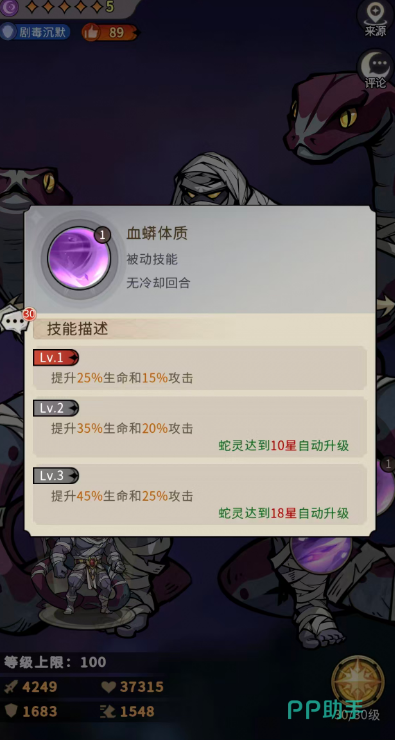 当蛇灵星级达到16星时,该技能升级为对敌方全体造成134%物理伤害,追加伤害提升至自身最大生命值9%,【剧毒】附加概率同步增至60%,并在技能释放后,驱散我方随机1名单位的所有负面状态。觉醒后再次强化:伤害提升至144%+10%物理伤害,驱散范围扩大至随机2名友方单位的全部负面效果。配合其被动【血蟒体质】——18星时提供45%最大生命值与25%攻击力加成(16星前为25%生命+15%攻击),使其在生存、输出与团队辅助三方面均形成稳固支撑。
