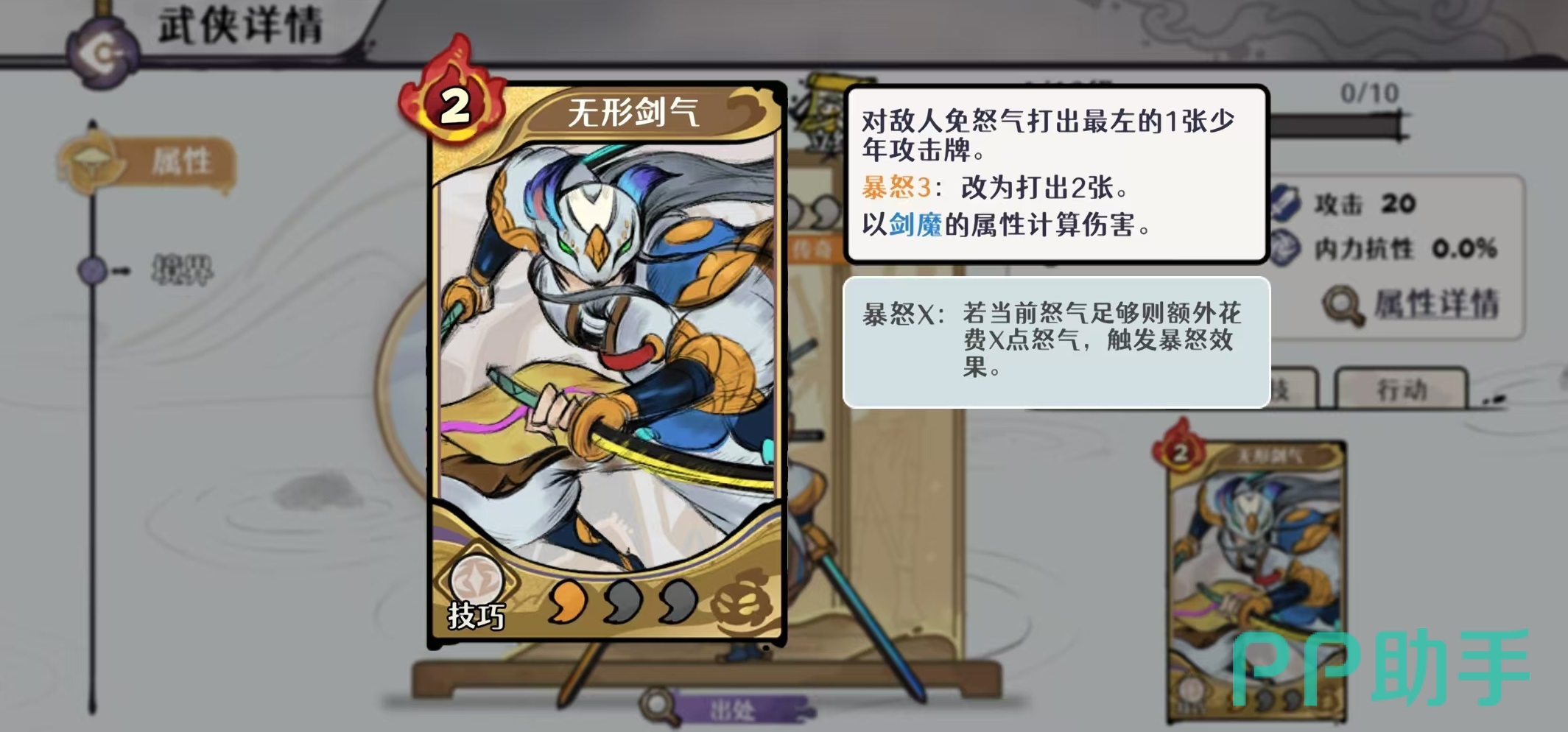 剑魔在游戏的定位是t0级的外功主c,他适合单核开荒以及在幻境等活动中使用,堪称是pve中的全能选手,无论是真气技能还是怒气技能,实现了双开花,下限高一拖二的能力非常强,这些都展现了剑魔在目前游戏中的强势。剑魔的真气技可以对敌人造成外功伤害,本回合每消耗一点怒气,可以额外再附加外功伤害。武学技能是无形剑气,对敌人免怒气打出最左的一张少年攻击牌,暴怒效果是改为打出两张。这些特点使得剑魔成为了高频循环的核心。