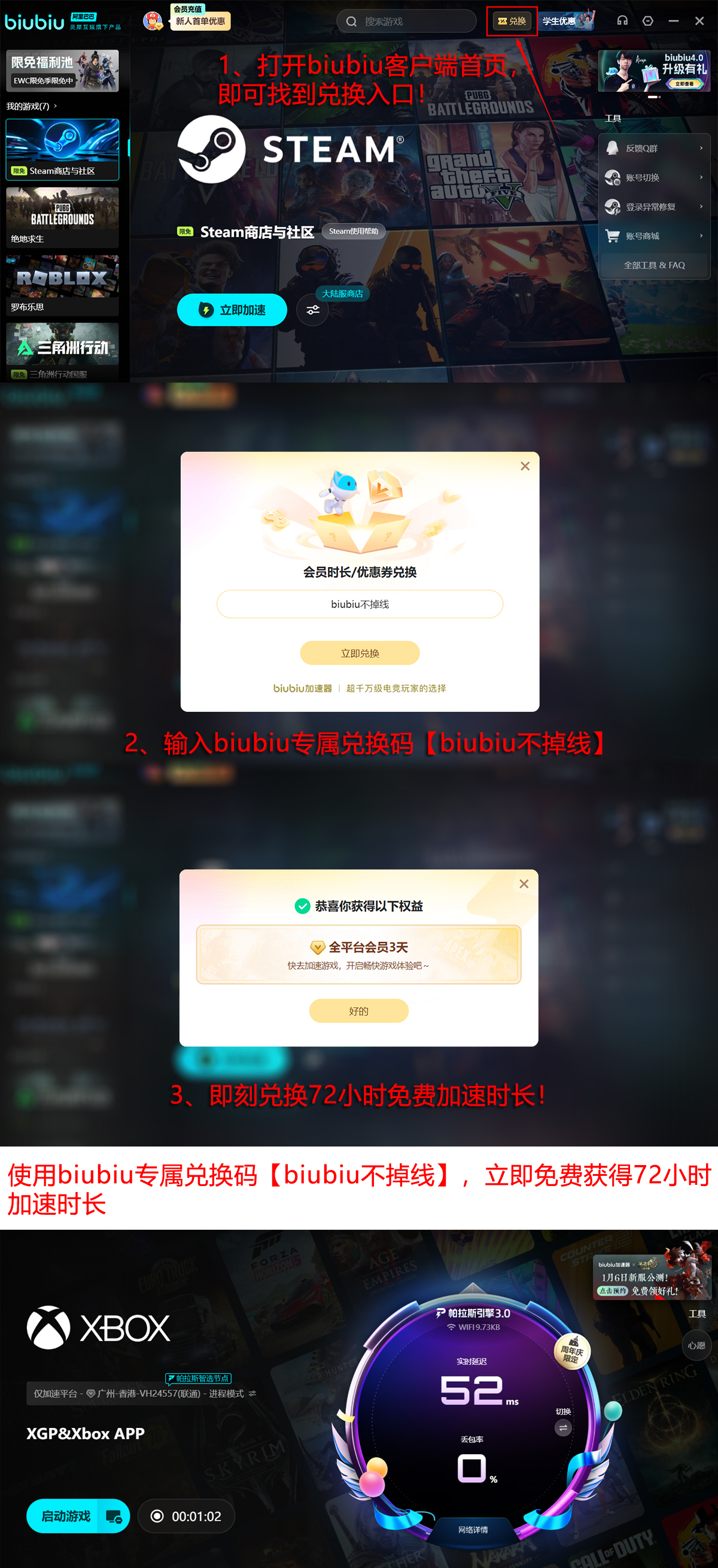 新用户注册后可即时领取24小时免费加速时长;完成“biubiu不掉线”任务后,还可额外获得72小时服务权益,累计达96小时。此外,在12月18日至1月18日期间,平台开放限时免加速服务池,覆盖范围进一步扩大,Xbox平台用户可直接调用全部新增支持的游戏列表,无需额外配置即可启用。