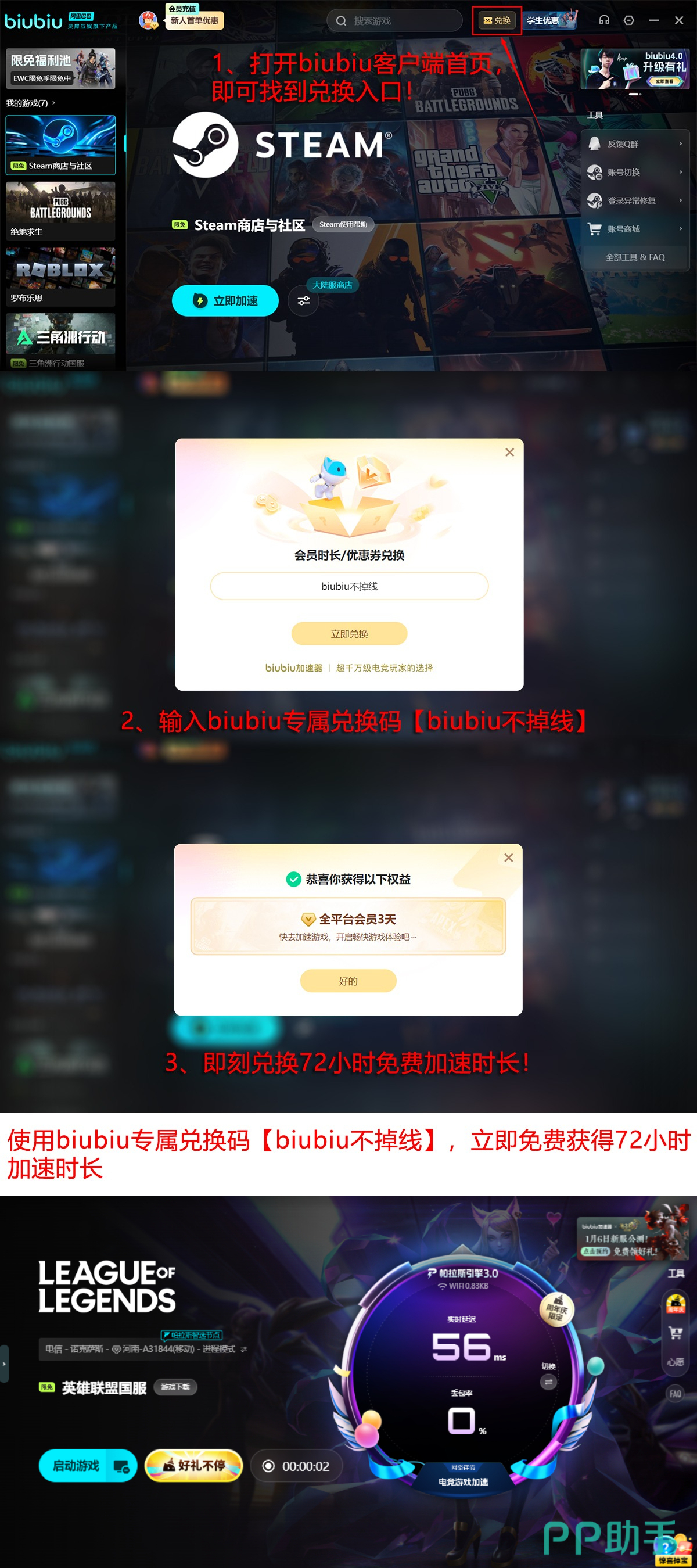 即刻注册biubiu加速器账户,即可解锁24小时全功能体验权限,在游戏内输入激活码【biubiu不掉线】,即可在召唤师峡谷内实现72小时无中断对局,两步操作即可累计领取96小时专业级加速服务,全面改善操作响应与画面流畅度。