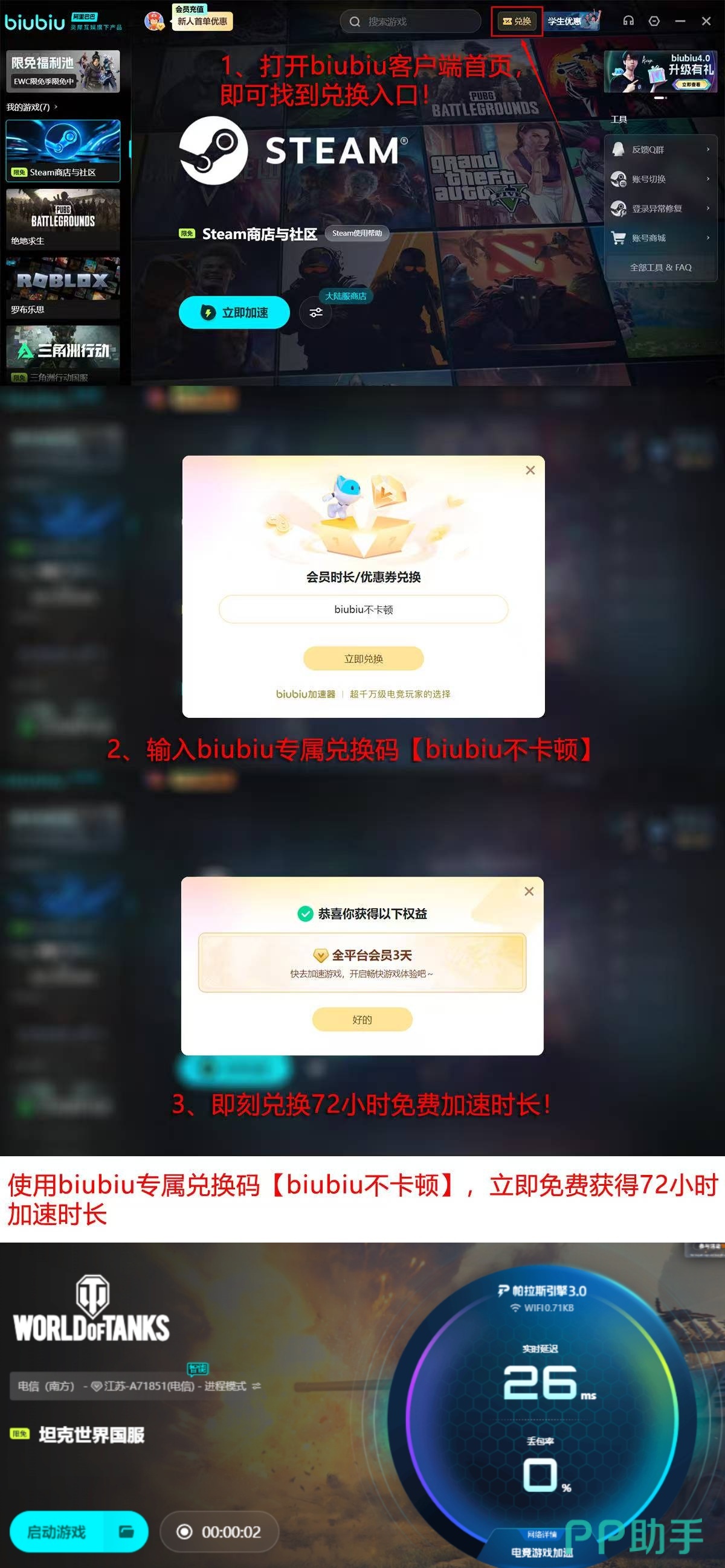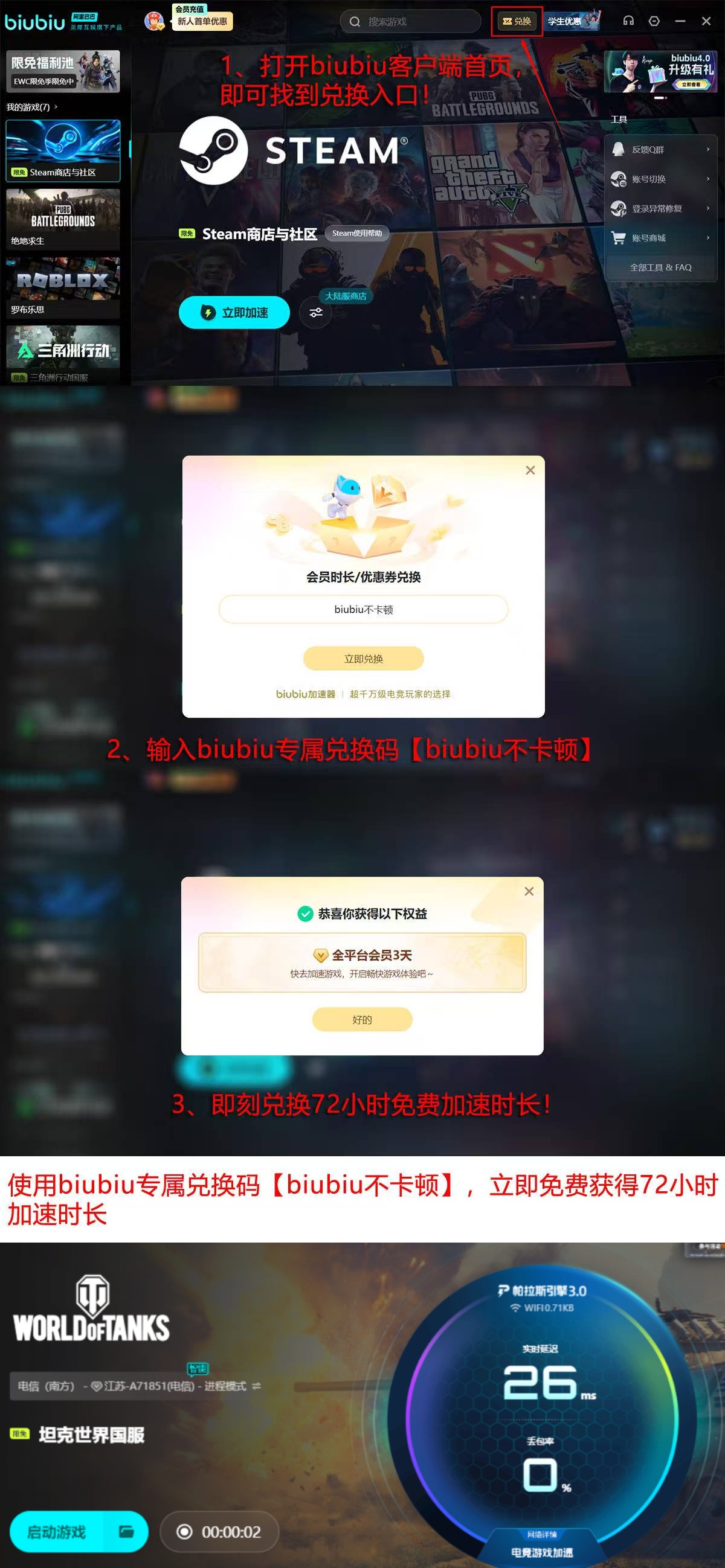 依托广泛用户基础与持续迭代优化,biubiu加速器同步推出限时福利政策:新注册用户完成首次账户激活后,即可即时领取1天免费加速时长;另可通过输入兑换码【biubiu不卡顿】额外获得72小时连续使用权。两项权益叠加,总计可享96小时无中断加速服务,充分保障高强度对战场景下的连接可靠性。
