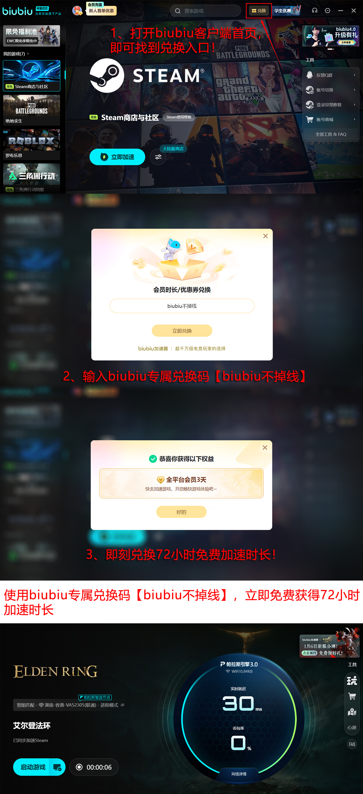 新用户注册并完成首次登录后,即可领取专属加速时长:基础福利为24小时免费使用权限;叠加参与“biubiu不掉线”活动,还可额外获得72小时服务时长;两项权益合并计算,新人最高可享累计96小时的加速服务,覆盖多周目挑战及高强度联机需求。