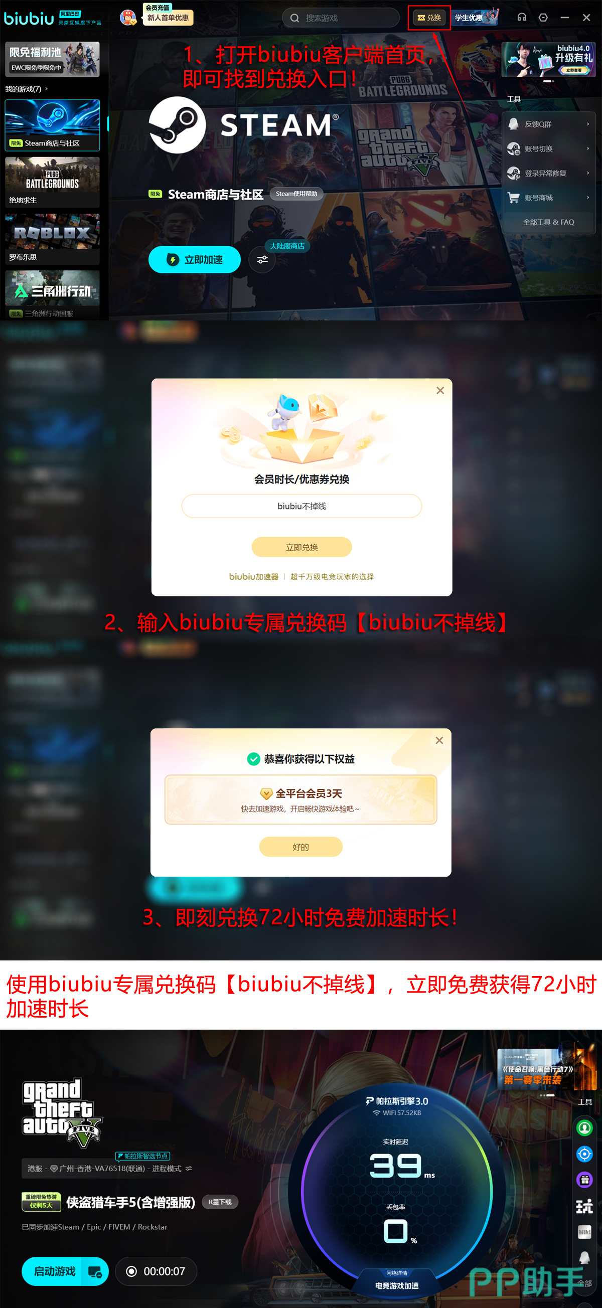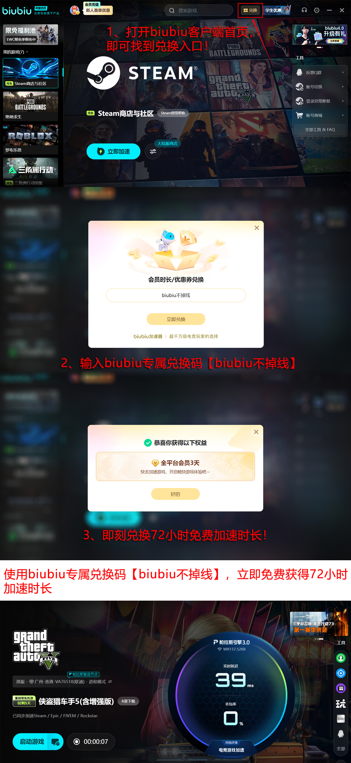 当前正值冬季运营期,biubiu推出新人激励计划:完成注册并登录后,即可领取24小时加速服务时长;叠加【biubiu不掉线】权益,还可额外兑换72小时服务时长,合计享96小时可用权限。GTA Online前期任务密度高、经济积累周期长,使用稳定加速工具可显著提升任务执行成功率与资源获取效率,间接压缩成长路径耗时。