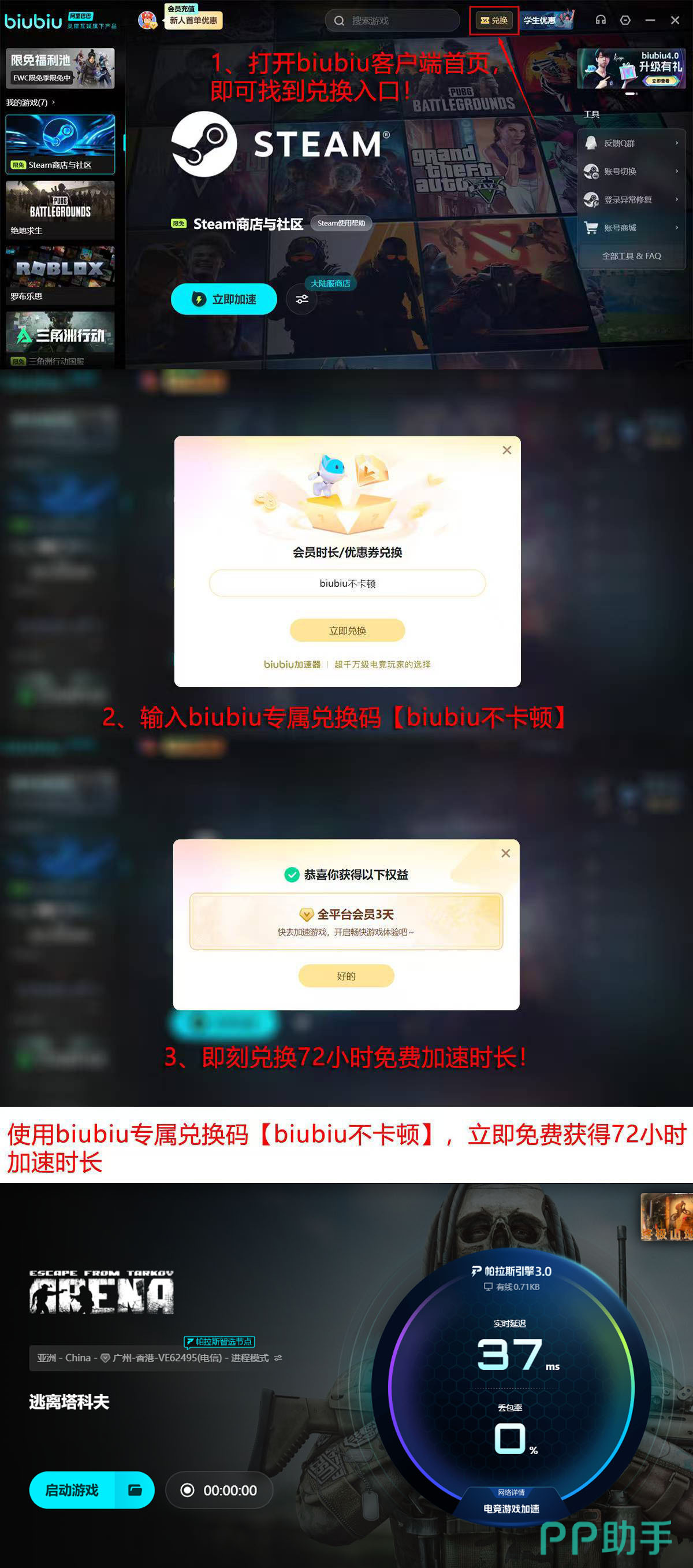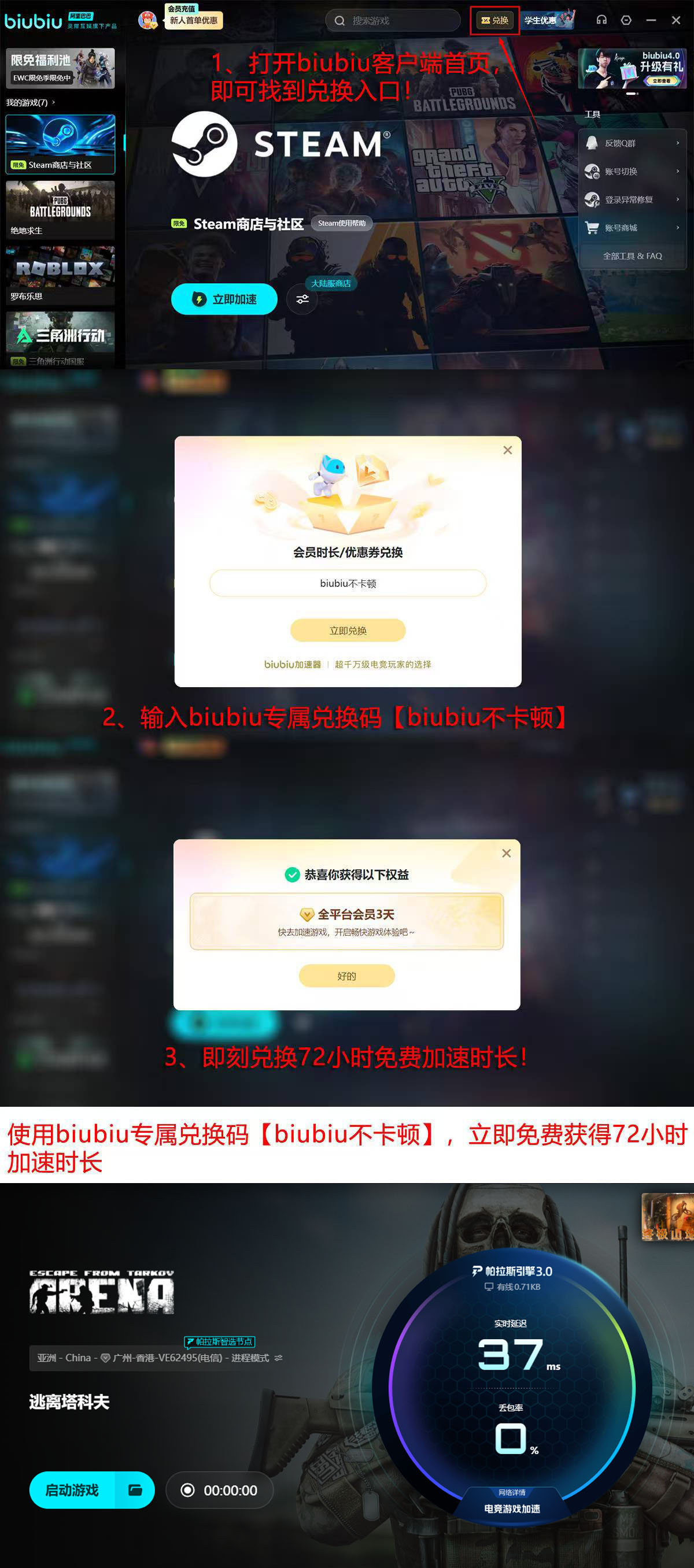 对于新用户,biubiu提供总计96小时免费试用权益:注册账号即赠24小时基础时长;登录后进入首页“兑换”弹窗,输入口令【biubiu不卡顿】(支持直接粘贴),可额外领取72小时加速时长,两项叠加无缝使用。此周期足以覆盖完整竞技场赛季体验,包括新手引导、装备配装调试及高强度对战测试。值得注意的是,专线加速带来的不仅是“能进游戏”,更可同步改善画面流畅度、减少射击判定延迟、提升投掷物轨迹预测准确率等深层体验维度。