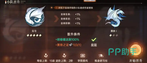 点击在主界面右侧中心的菱形按钮就可以进入小队评级之中,小队队伍评级功能中,共计分为评级提升、炼金研习社和学院委托三个部分,在游戏游玩过程中,几乎大部分玩法都是能帮助累积历练经验,比方说历练经验、主线剧情等等。