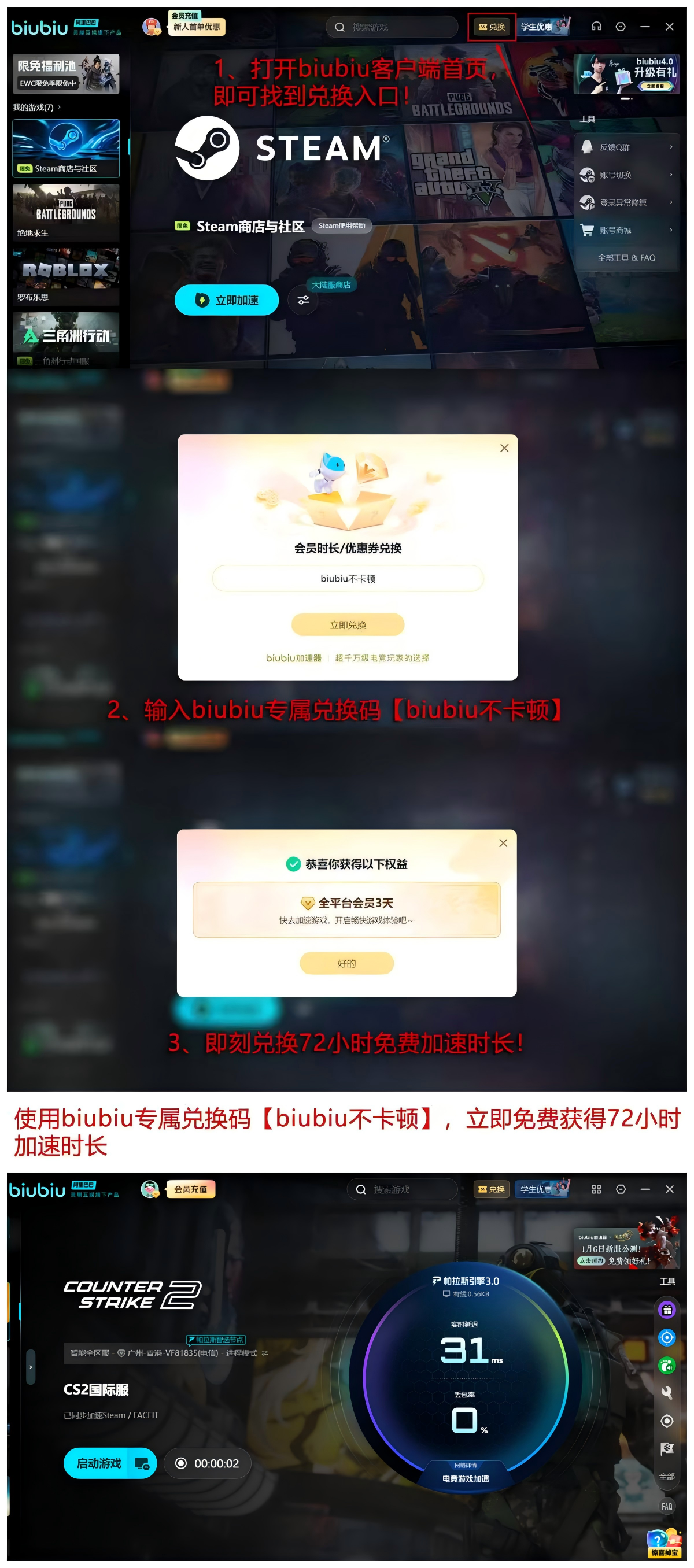 【biubiu不卡顿】新用户可享24小时试用,叠加活动共得72小时权益,总计最高可达96小时连续使用时长,该周期覆盖多数中短期排位需求,亦支持口令延长体验,兼顾实用性与灵活性。
