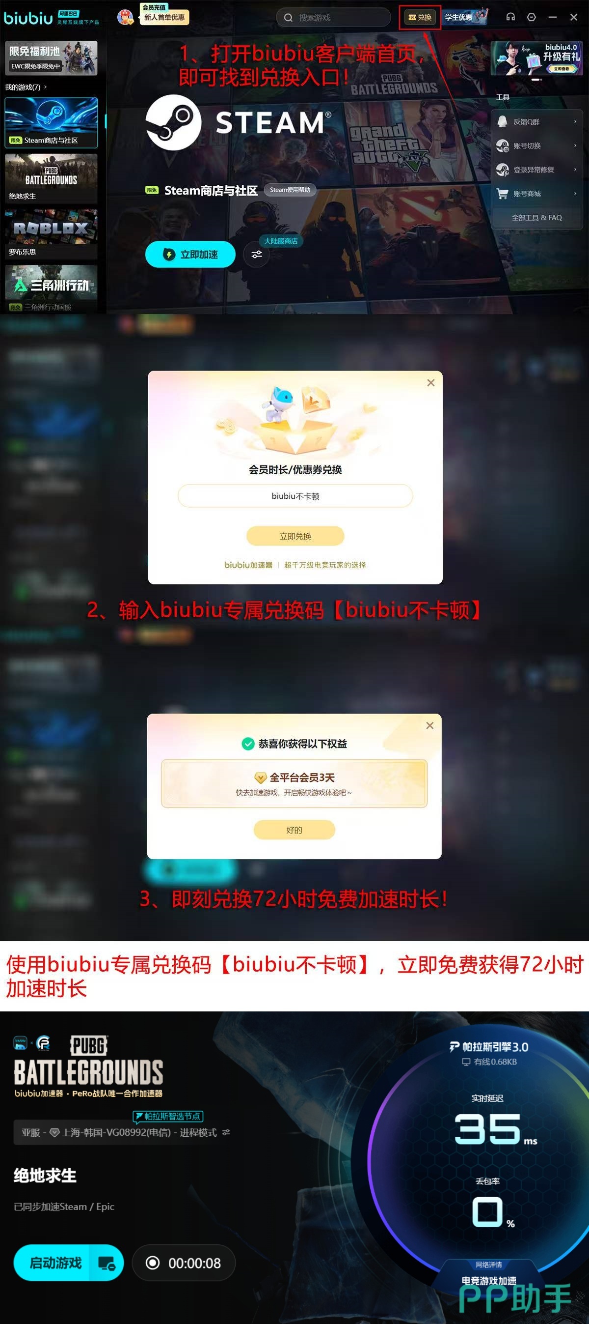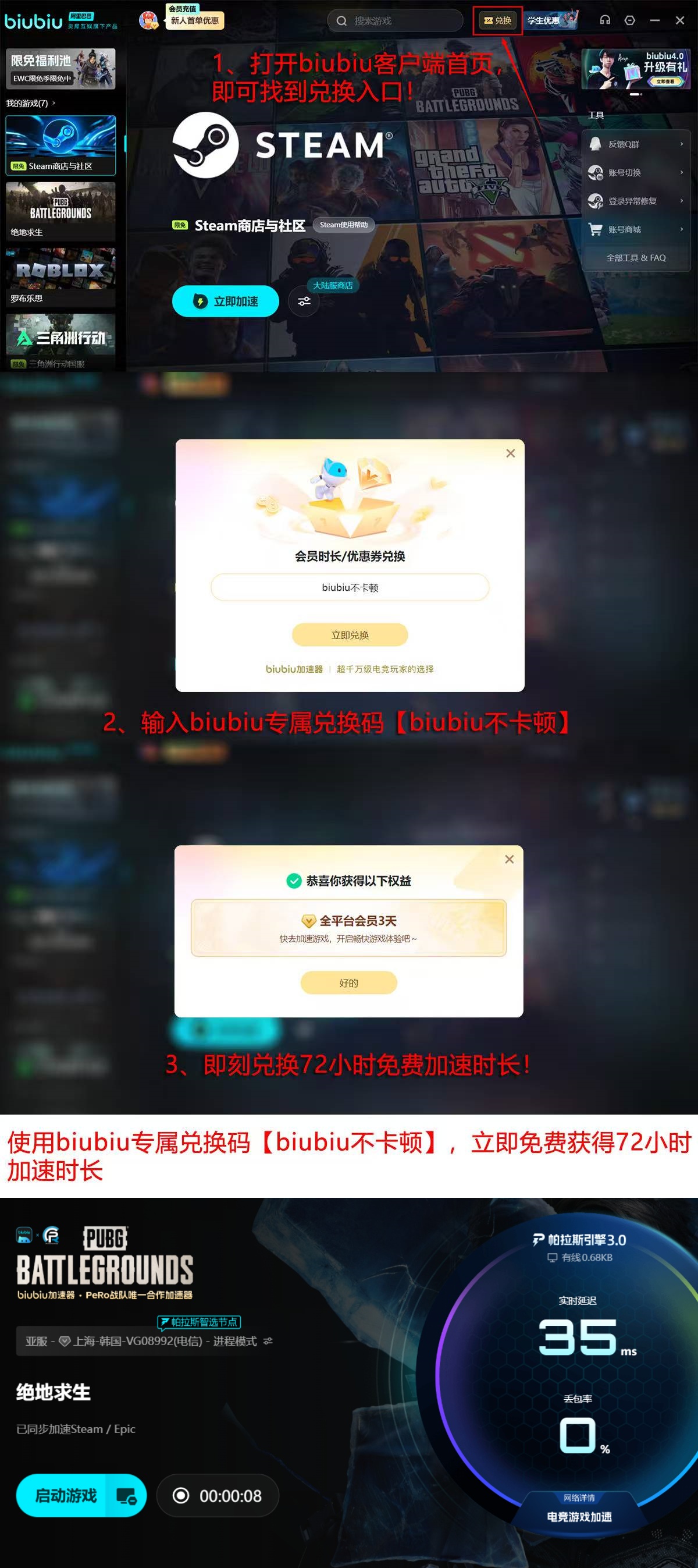新用户注册后可立即获得24小时全功能免费加速权限;平台同步发放通用激活口令“biubiu不卡顿”,输入后可额外领取72小时VIP加速服务,两项权益支持叠加使用,总计可享96小时连续加速体验,覆盖全部支持游戏列表。