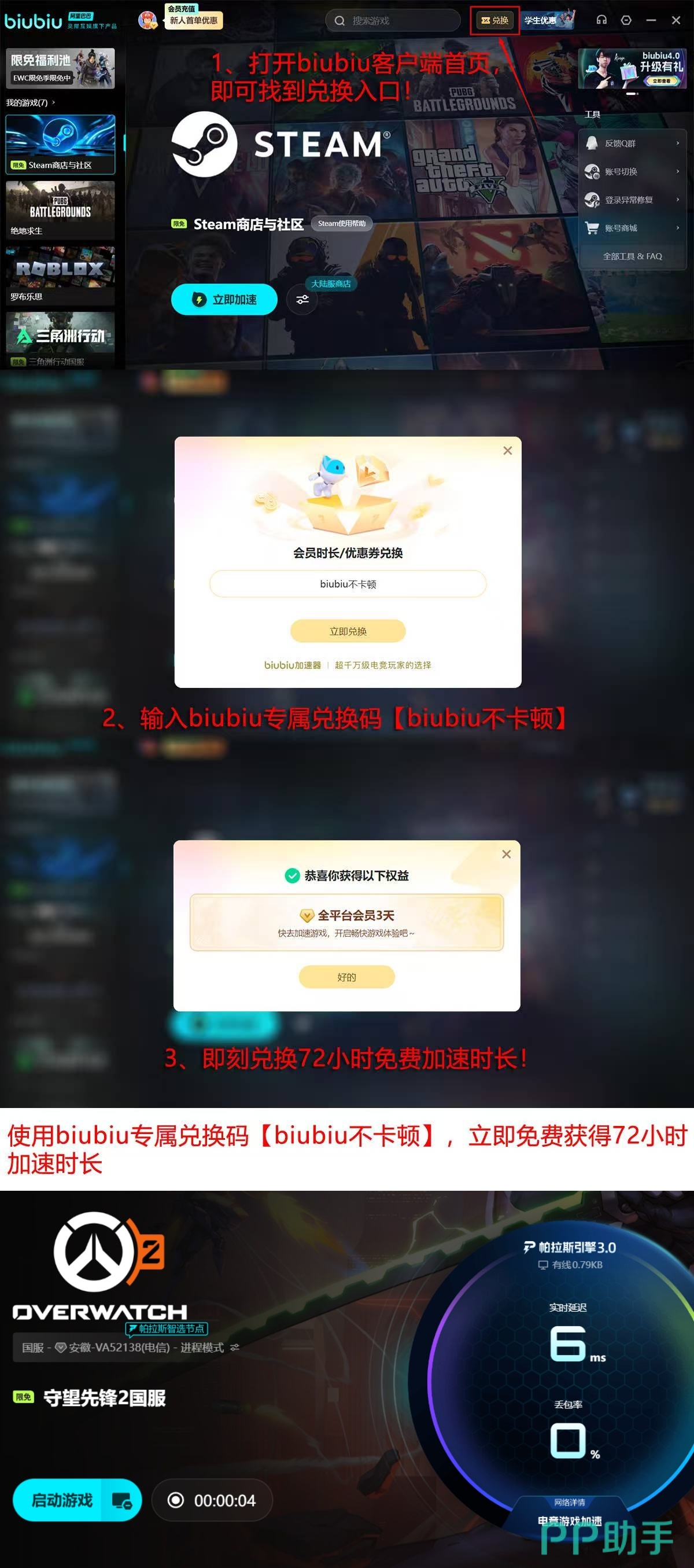 为降低用户试用门槛,biubiu提供新用户专属加速权益:完成实名注册即可获赠24小时全游戏免费加速时长;输入口令“biubiu不卡顿”,额外解锁72小时加速权限;两项叠加总计可达96小时连续使用周期,充分验证其在《守望先锋》实战环境下的连接稳定性与帧率一致性表现。