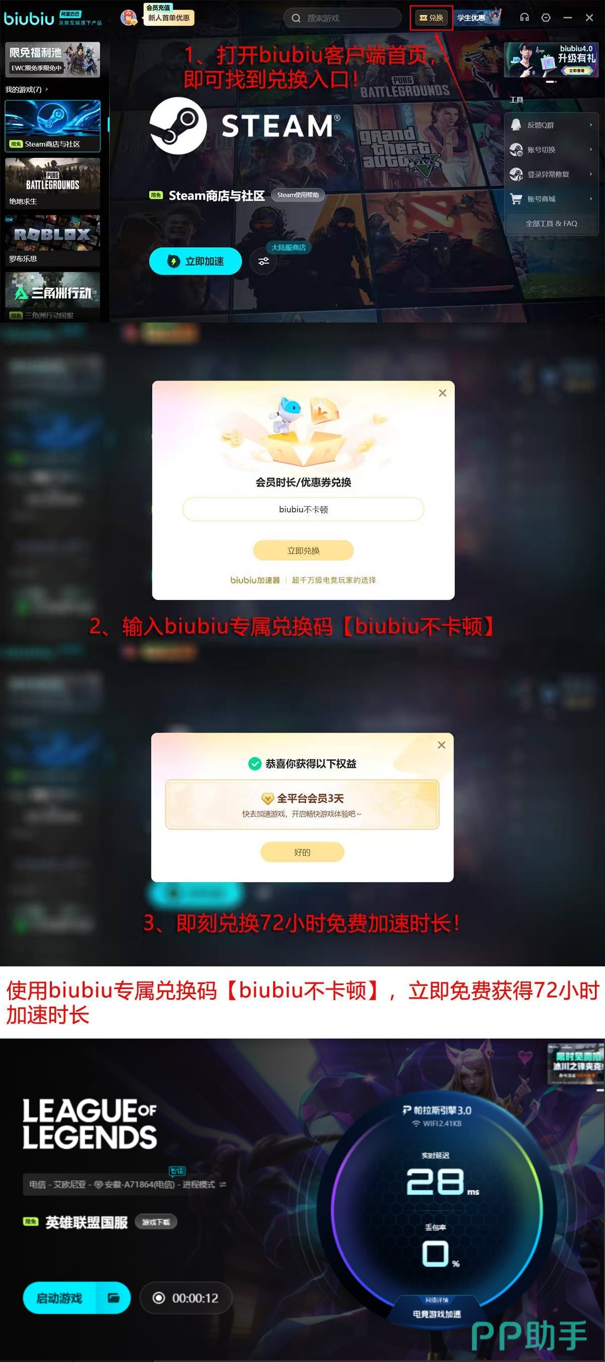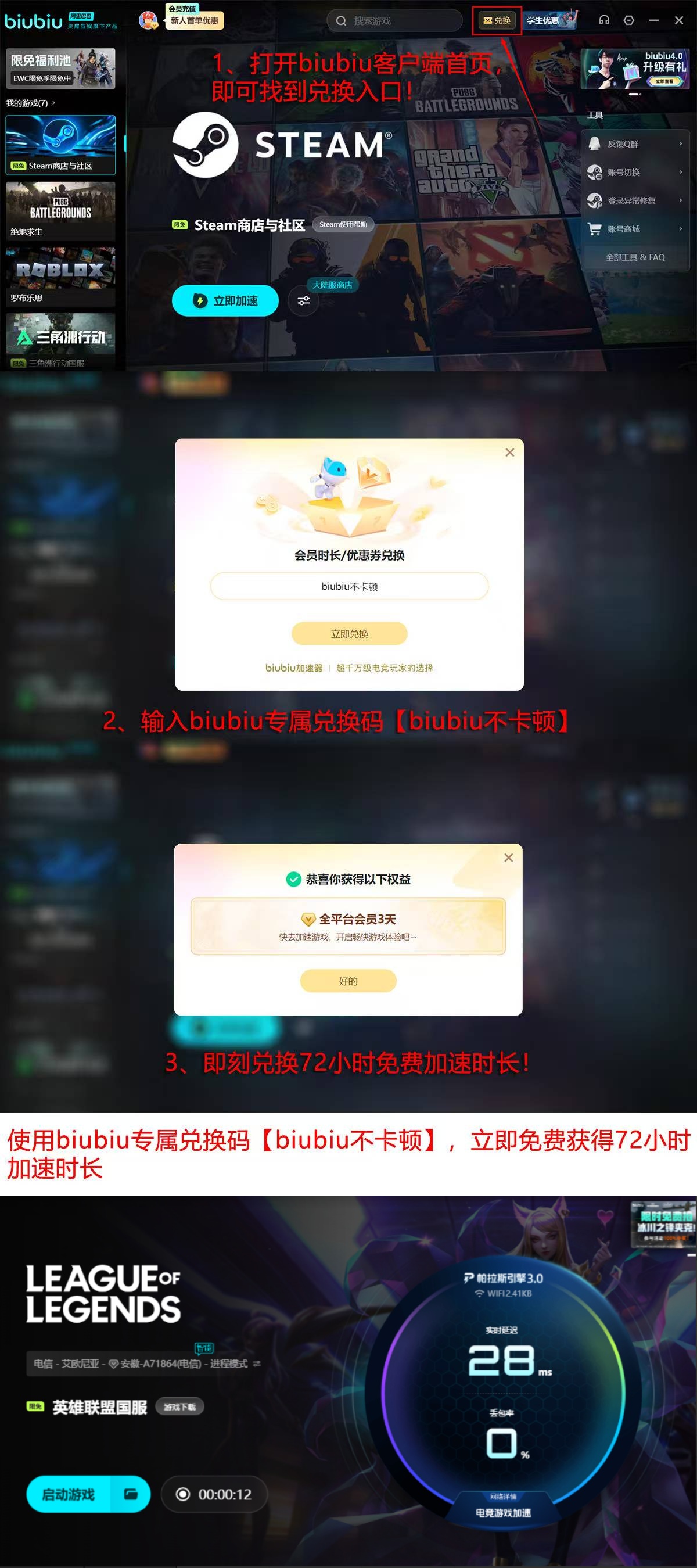 为降低使用门槛,biubiu加速器同步开放两项新人权益:新用户完成账号注册后,即可获赠24小时免费加速时长;另输入专属兑换码【biubiu不卡顿】,还可额外领取3天加速权限,累计达96小时全功能体验。