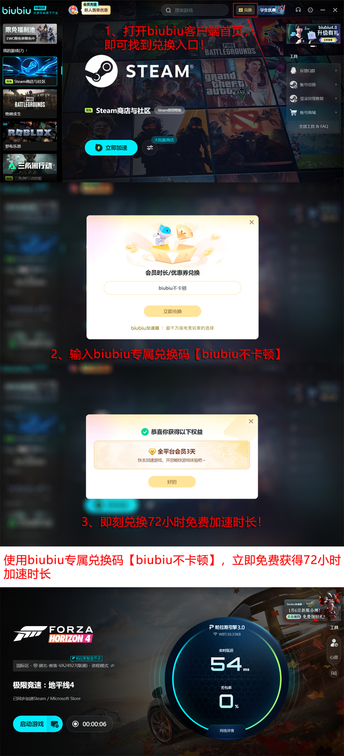 新用户注册biubiu账号后,可直接获得24小时免费加速时长。另提供通用兑换码【biubiu不卡顿】,单账号限用一次,可额外兑换72小时加速服务,老用户同样适用。