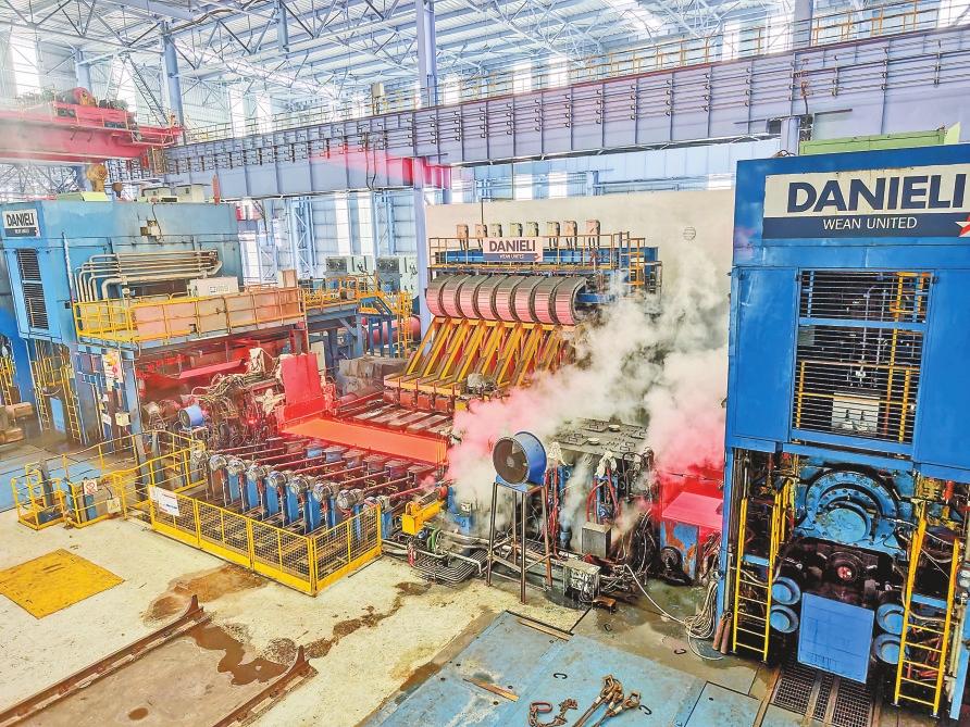 在QSP—DUE热轧带钢生产车间,火红的钢坯经过加热炉、过粗轧、进精轧,在火与水的淬炼之后,成为成品钢卷,整齐堆垛。整个过程智能化、自动化,只有两三位工人在车间中巡检设备。该生产线是从意大利达涅利公司引进的世界首个高架式QSP连铸连轧带钢生产线,能够以无头模式生产超薄规格产品,以单块模式生产厚规格产品,实现厚度范围0.8—25.4毫米热轧产品的全覆盖,满足客户对各种规格、种类、性能钢材产品的实际需求。