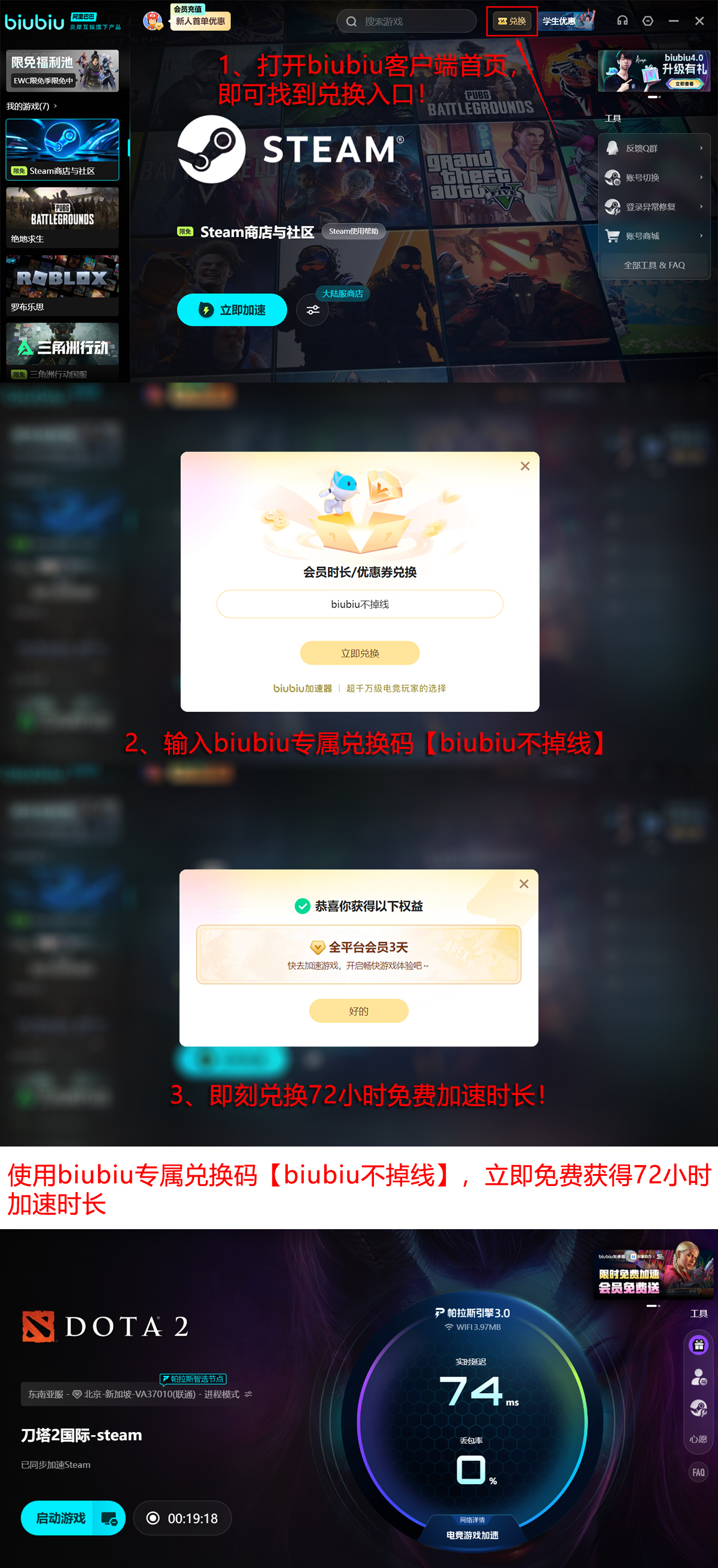 关注官方渠道获取专属福利:记住 【biubiu不掉线】这一兑换码,可免费领取3天加速时长。新用户首次注册并完成登录后,账户将自动激活24小时试用权限。两项叠加,总计可享受96个小时的无门槛加速服务。