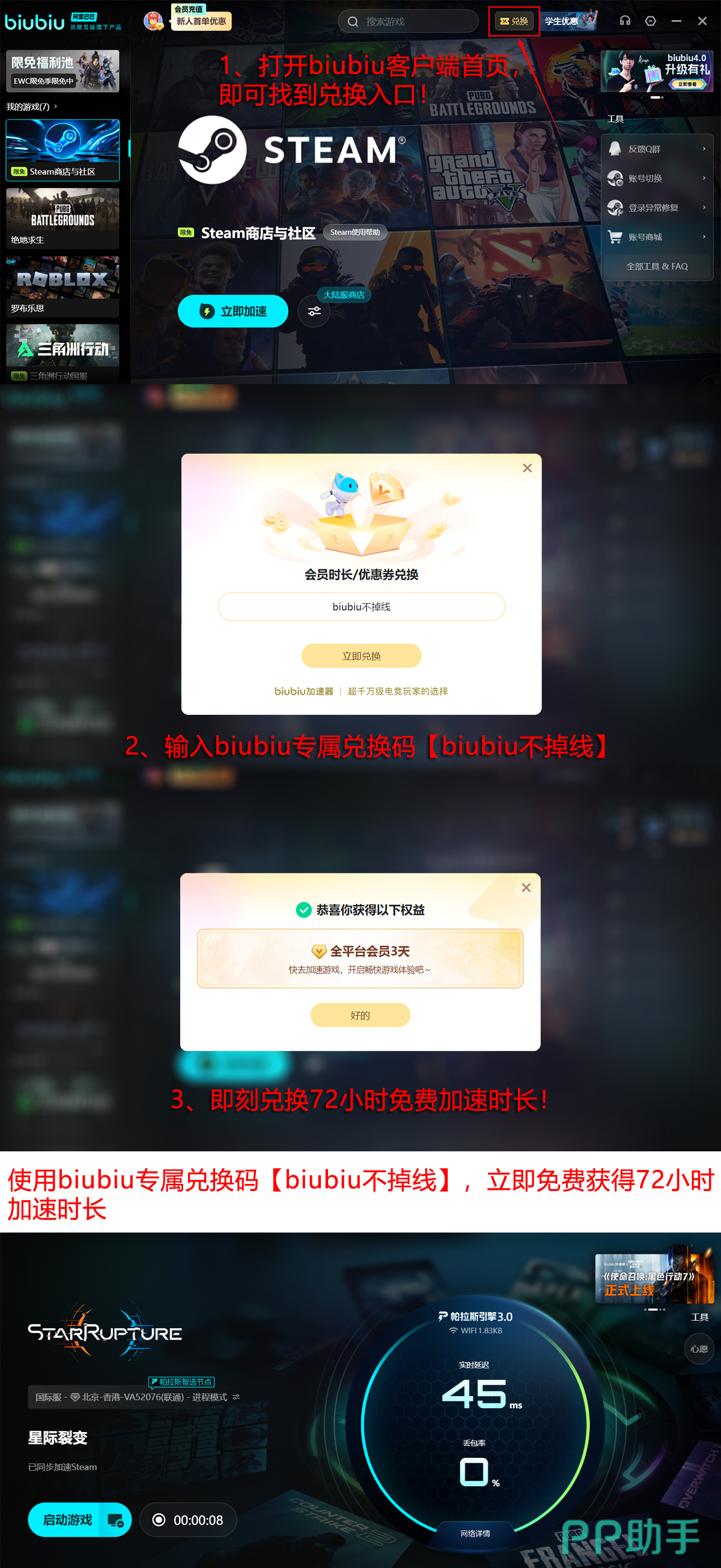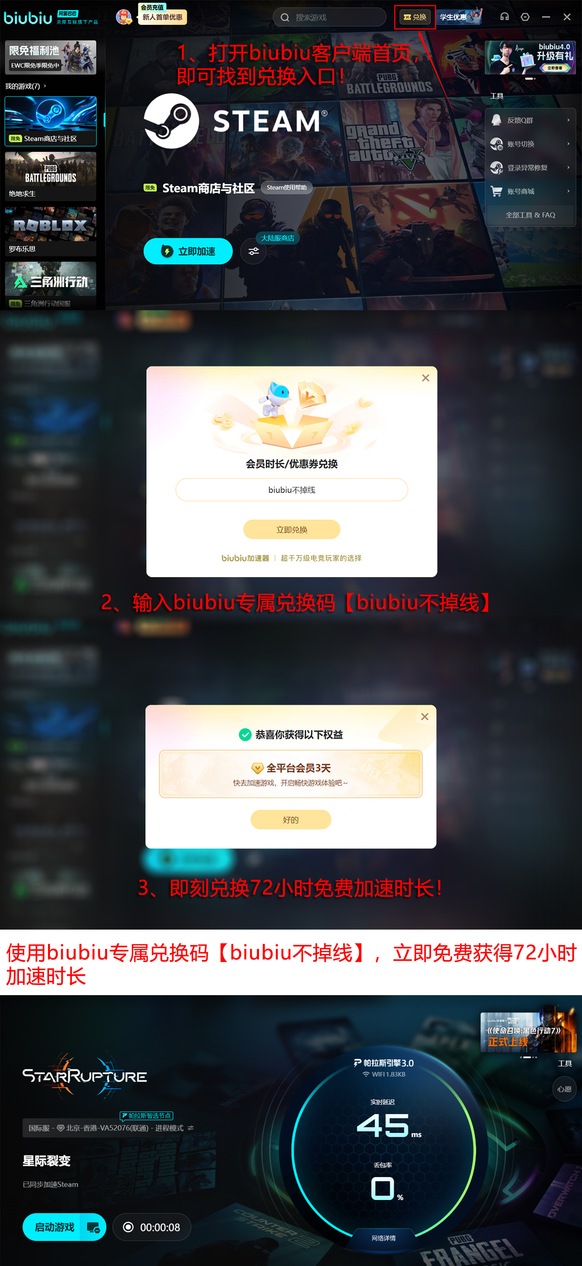即刻启用biubiu加速服务,新注册用户可直接激活24小时全功能试用权限,输入激活码【biubiu不掉线】即可额外延长72小时高速通道使用时长,总计享有96小时无限制加速权益,完全覆盖《星际裂变》下载、安装、初始资源加载及首章剧情推进所需全部网络支持周期。
