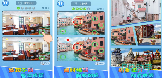延续经典视觉比对玩法,覆盖建筑、自然、人文等多元图像题材。每关提供上下并置的两张相似图,隐藏五处差异细节——可能体现为窗框颜色、枝叶疏密、人物朝向或光影明暗等微小变化。支持道具辅助识别,降低挫败感,延长游戏续航力。