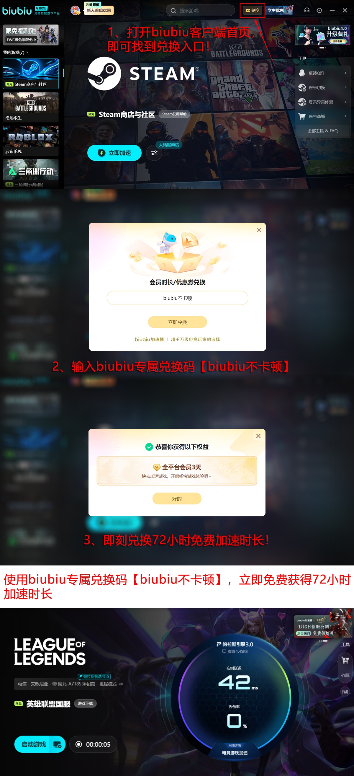 新用户注册即可激活24小时全游戏加速权限,覆盖《英雄联盟》及其他主流竞技产品,无设备数量限制。权益到期后,输入兑换码【biubiu不卡顿】可额外获得72小时加速服务,该码对新老用户均有效。综合计算,首次使用者可享连续96小时深度优化体验,实测显示技能释放延迟降低至8ms以内,普攻衔接与闪现接R等关键操作响应更趋“零感”,大幅提升团战容错率与决策执行精度。