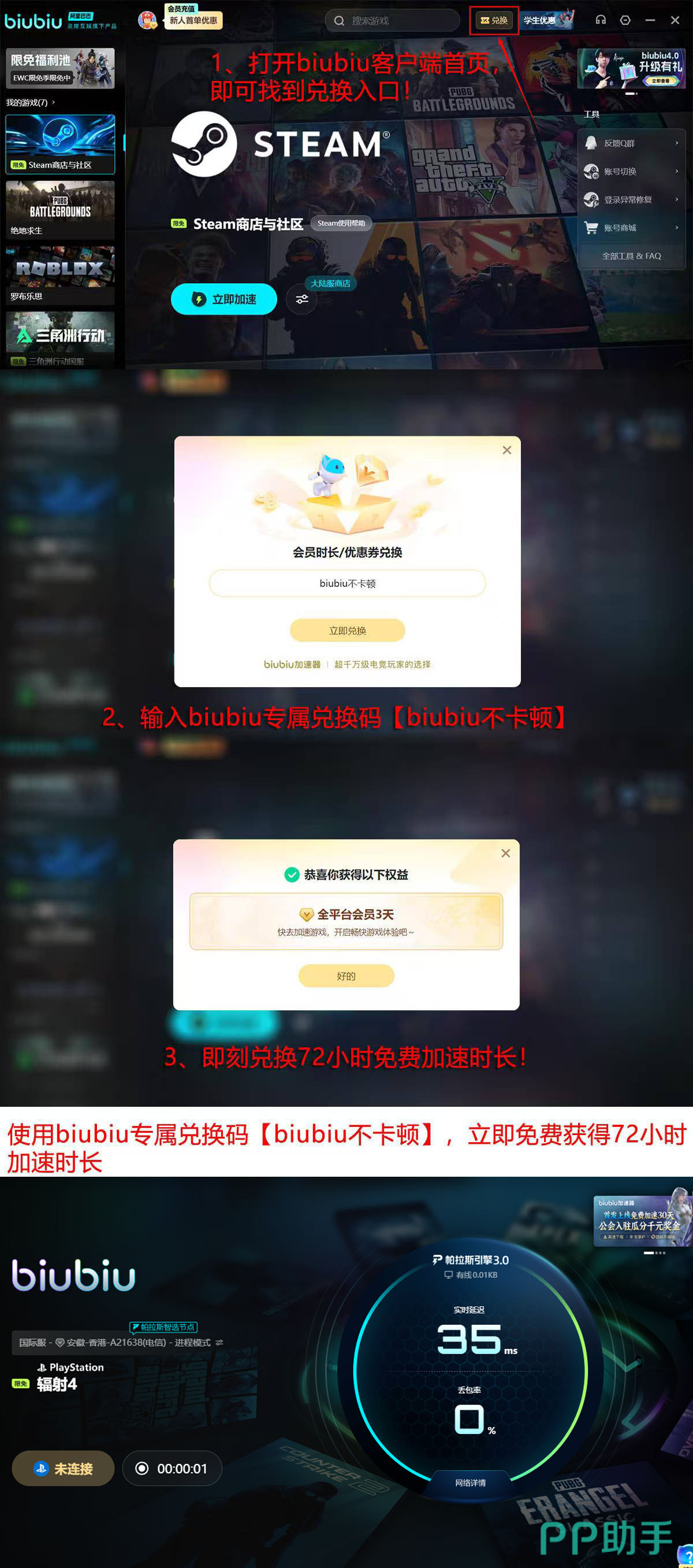 在《辐射4》实际应用中,启用biubiu加速器后,用户可感知到启动验证耗时缩短约40%,主菜单至废土场景的加载帧率更稳定,任务触发与UI交互延迟明显下降。为便于体验效果,平台提供总计96小时免费试用权限:新注册账号自动获得24小时新手权益;另可通过首页“兑换”入口输入口令【biubiu不卡顿】额外领取72小时加速时长,两段时效叠加生效。